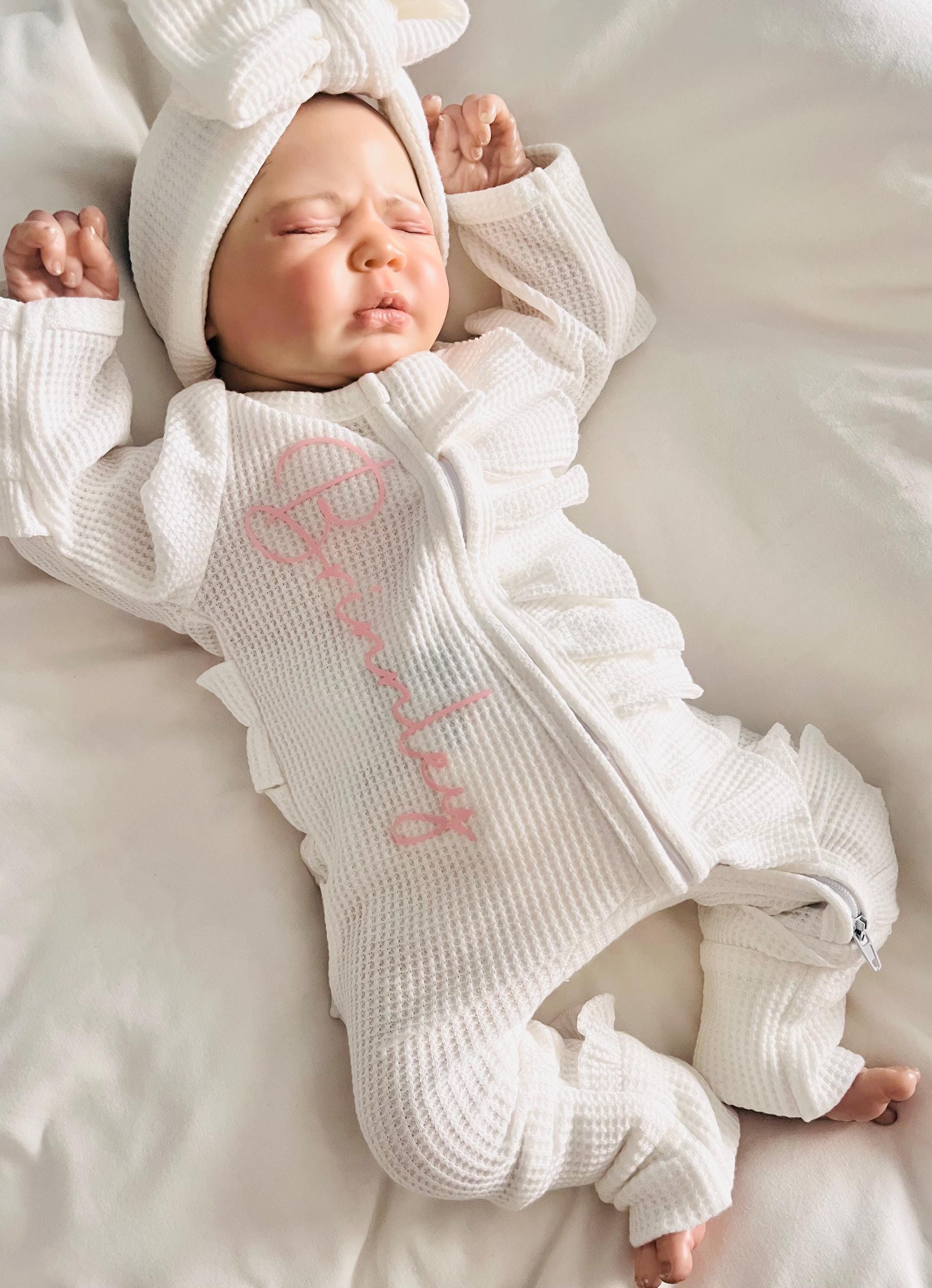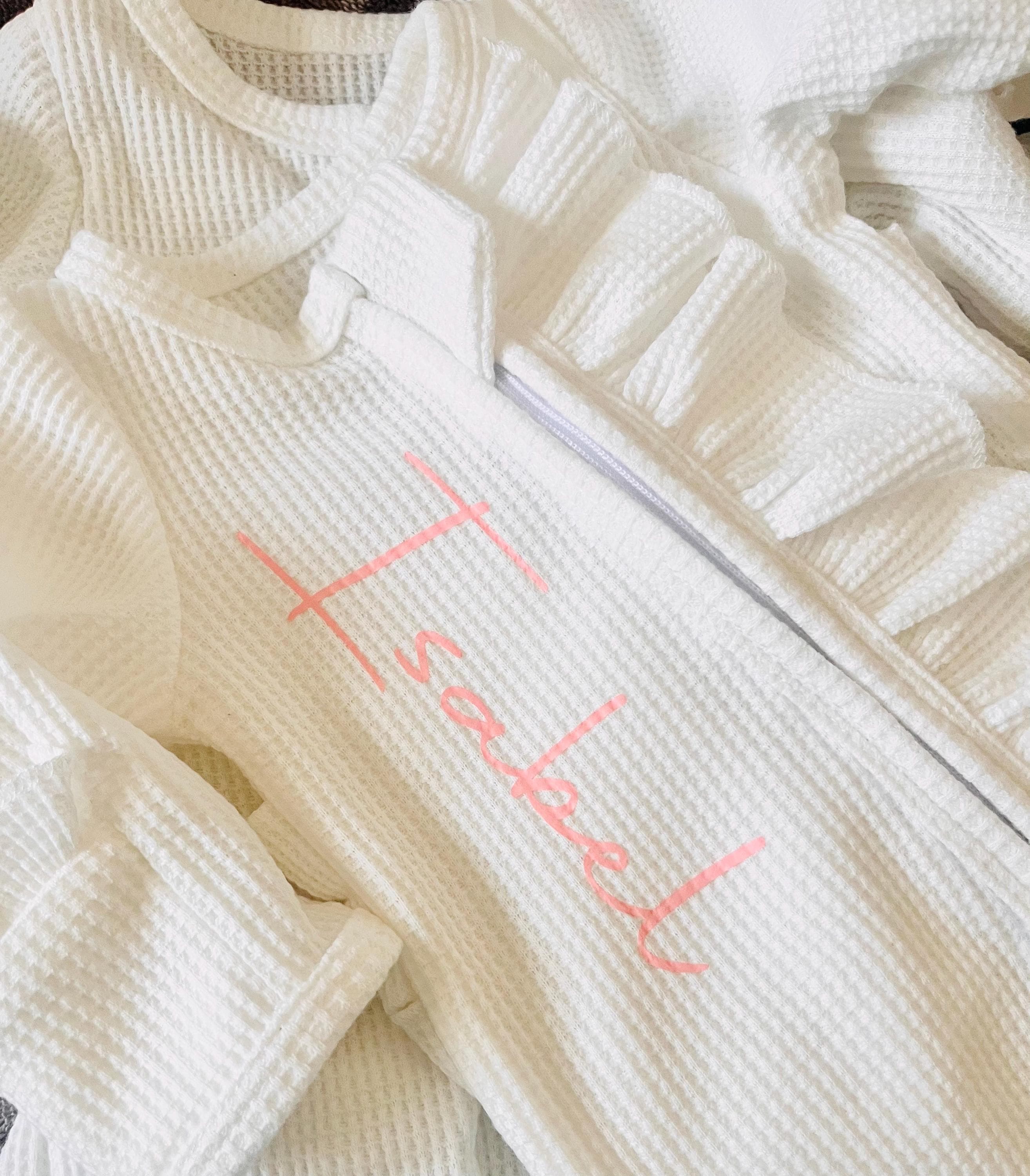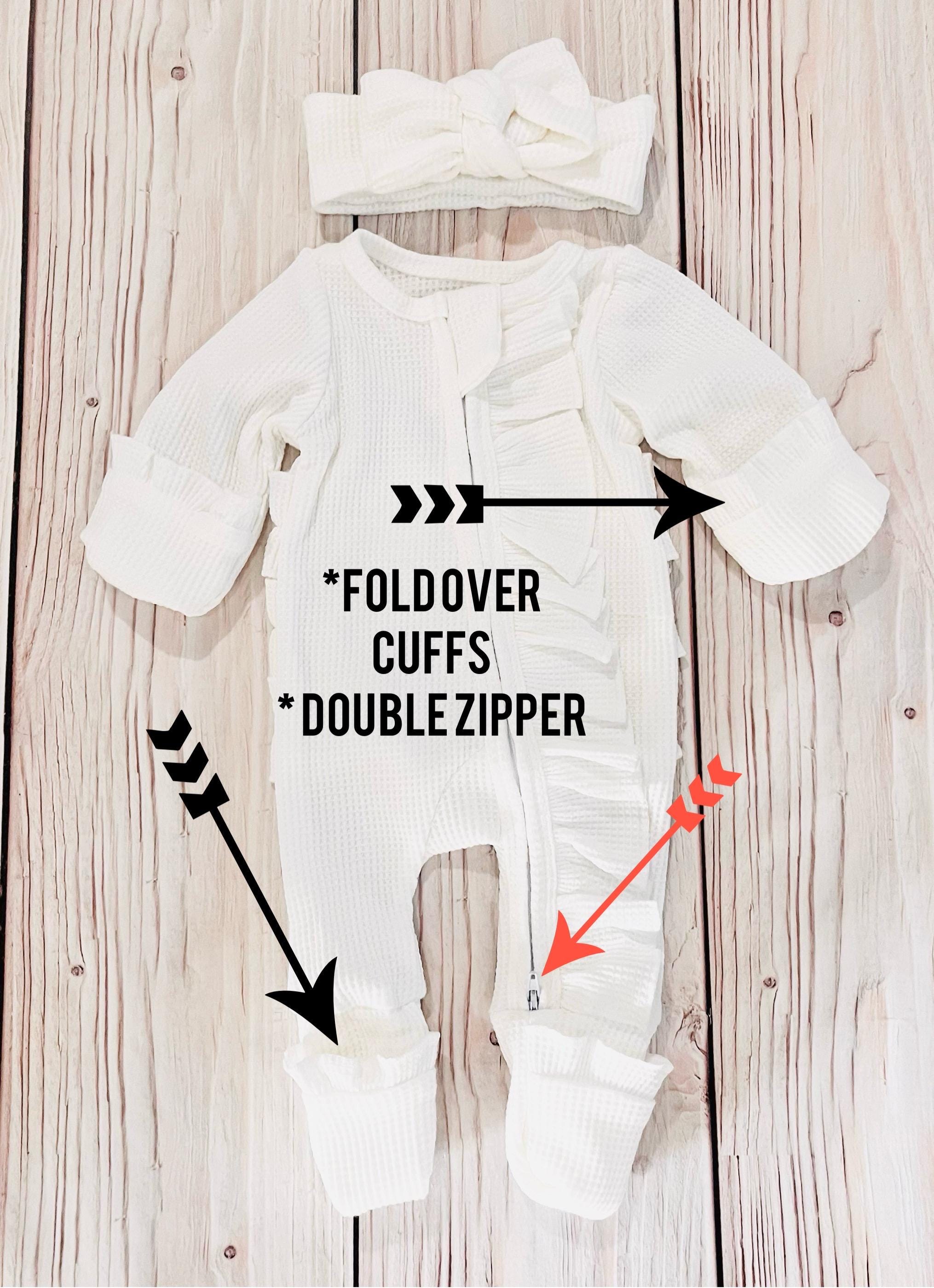 This outfit features a double zipper and fold over cuffs on hands and feet.