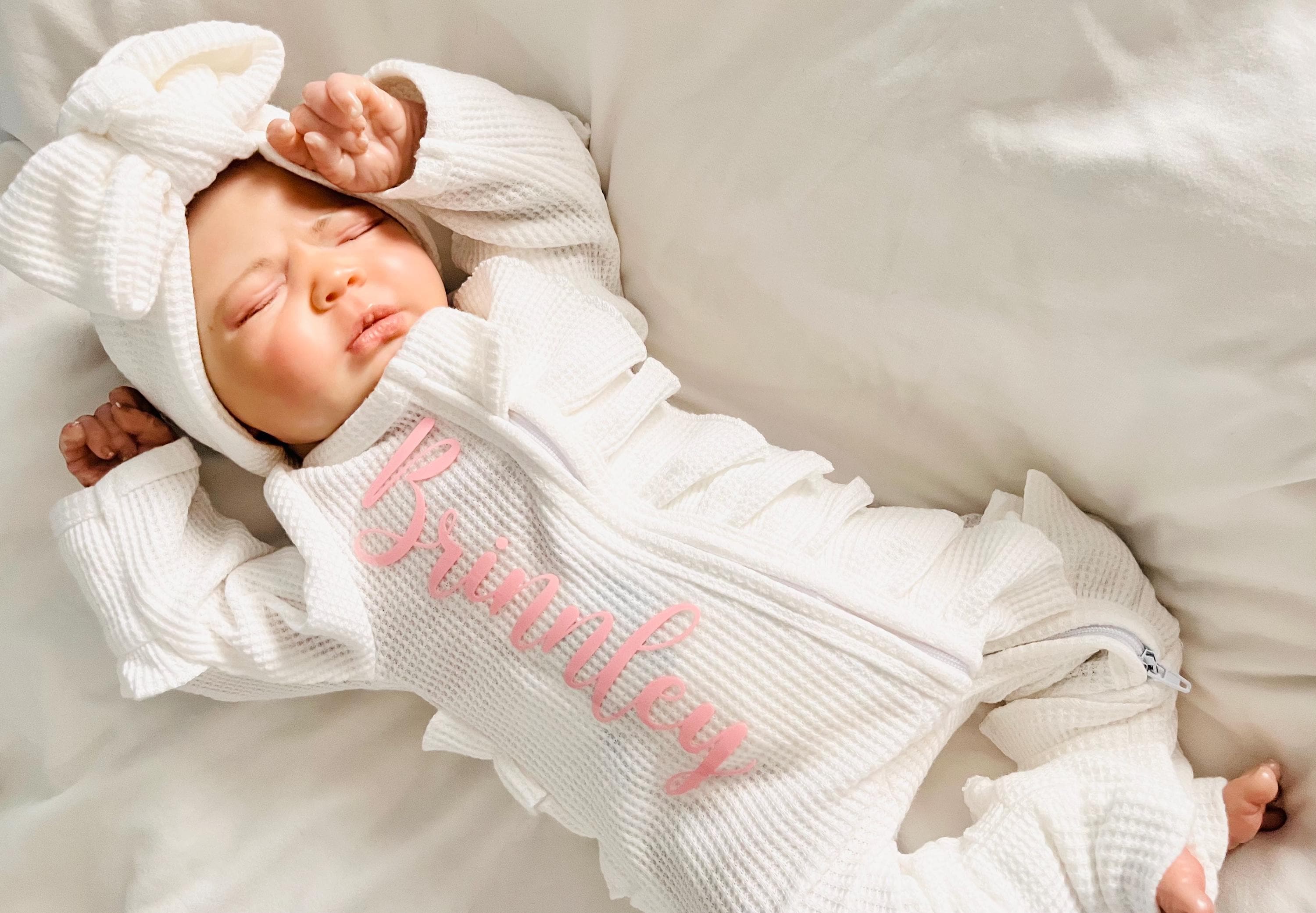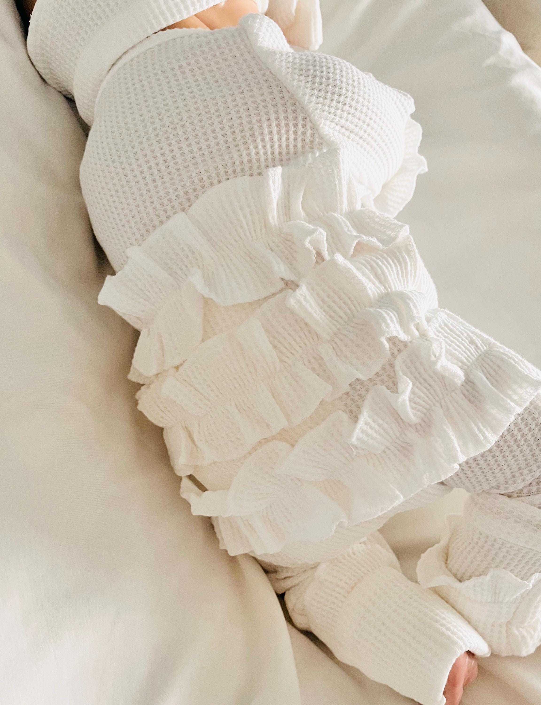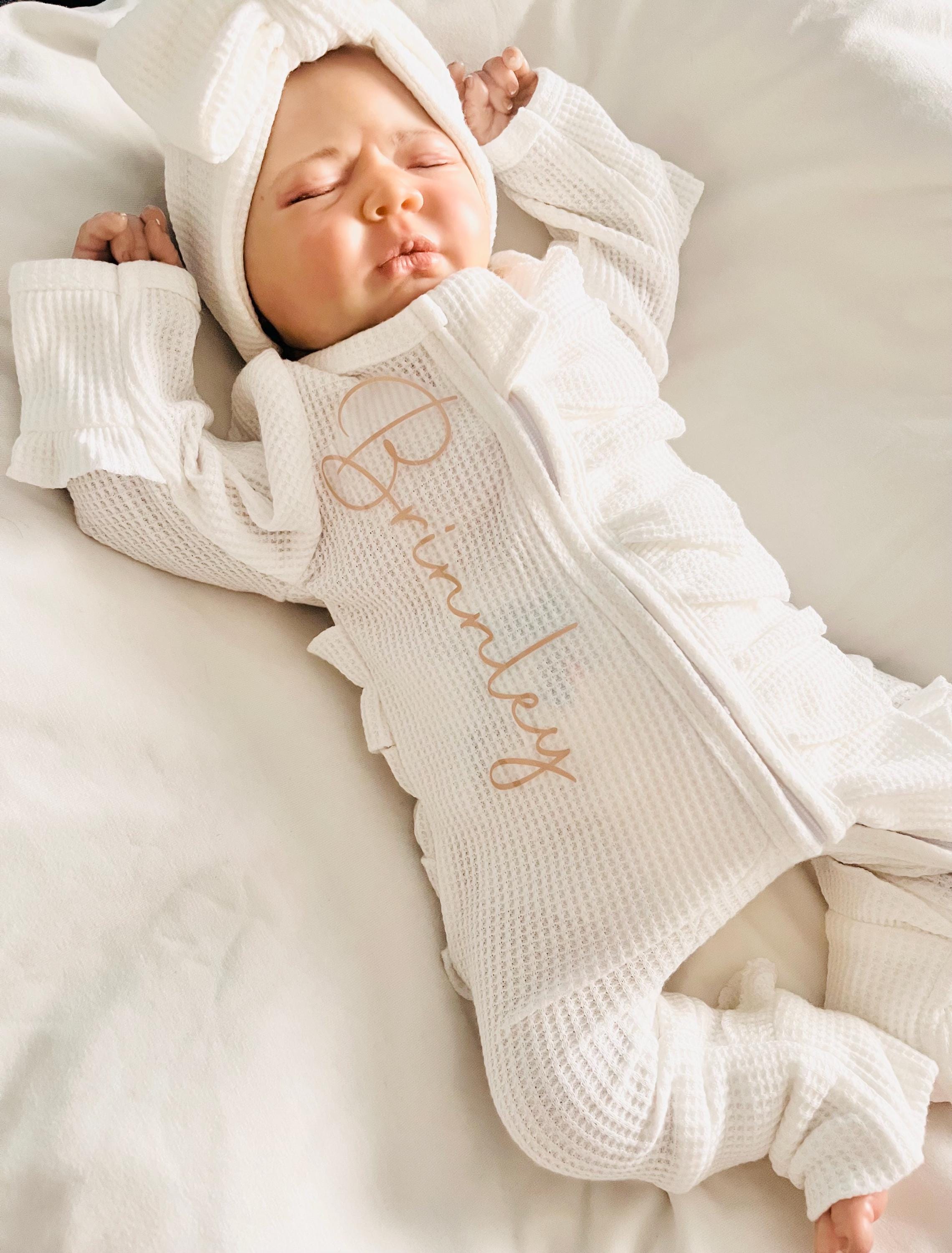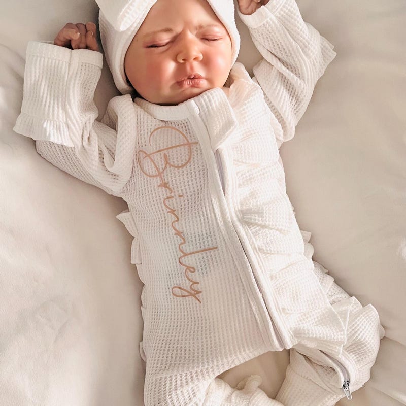 This outfit features a double zipper and fold over cuffs on hands and feet.