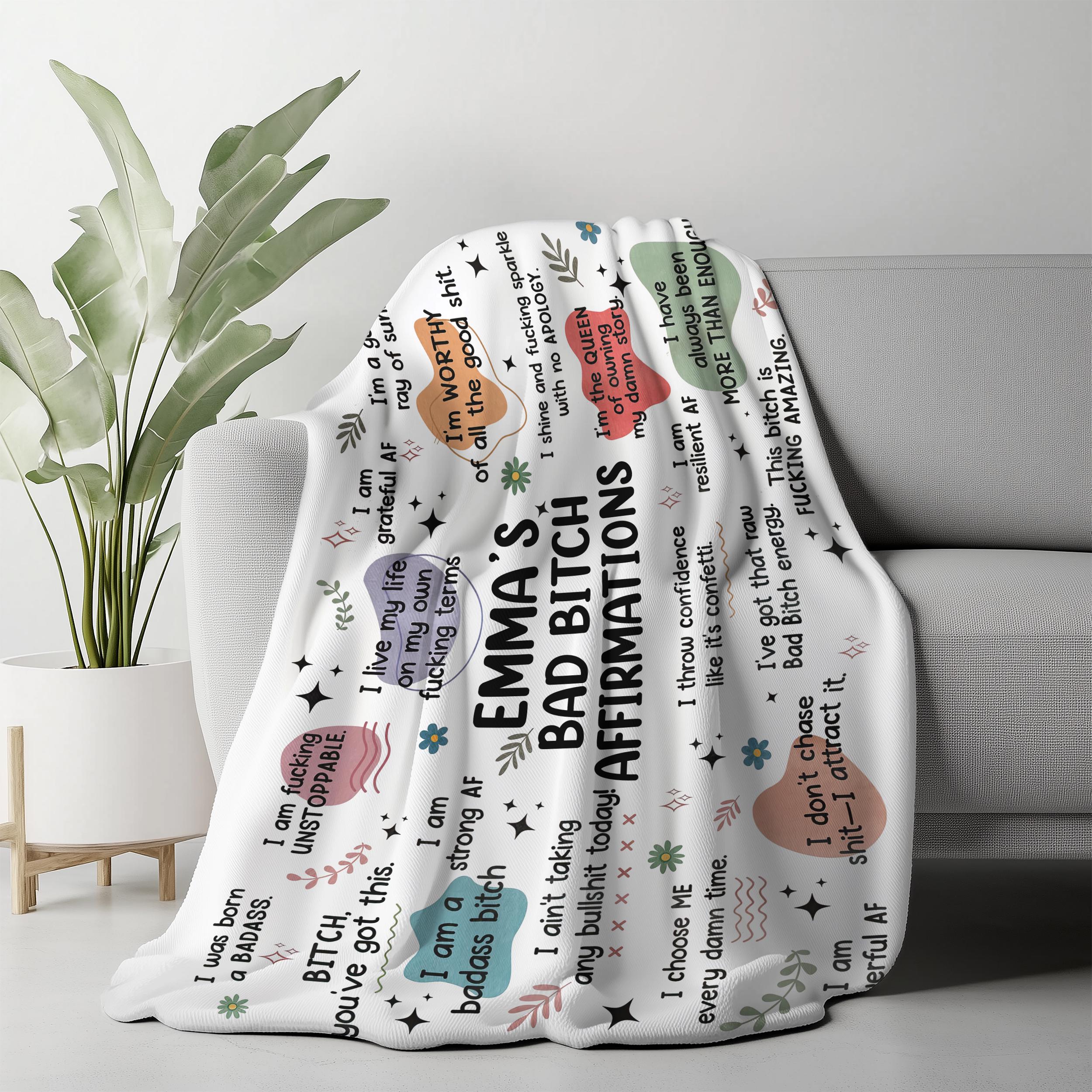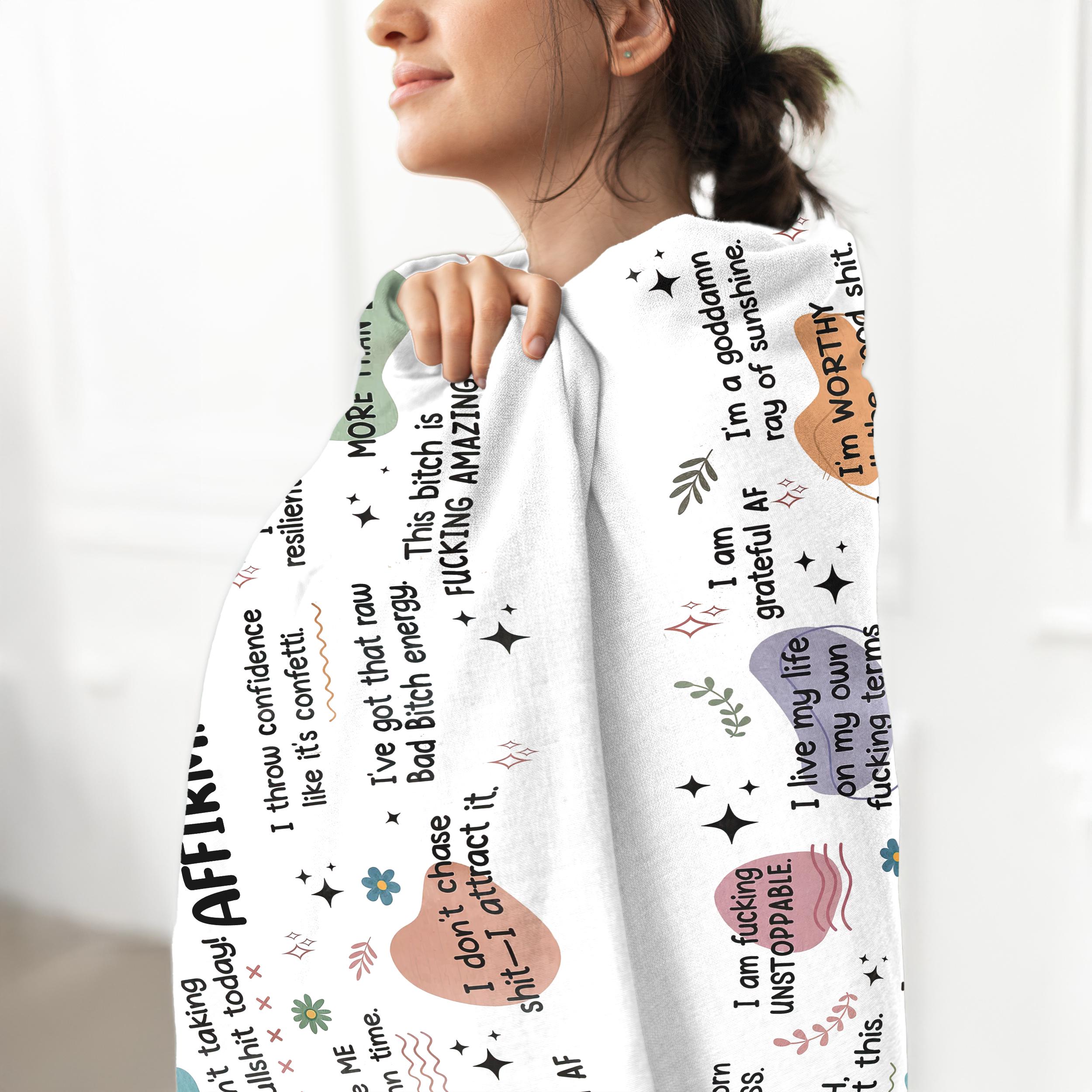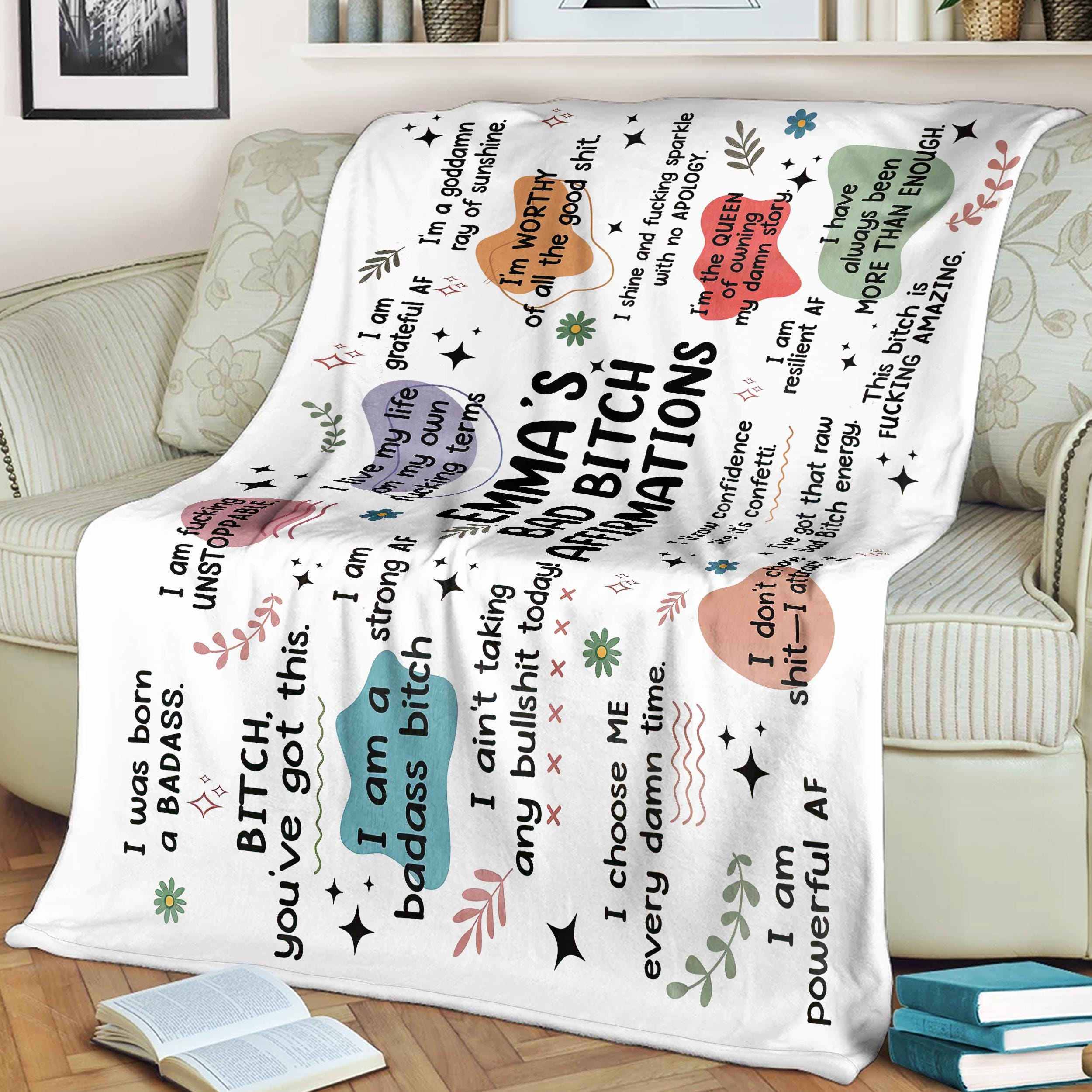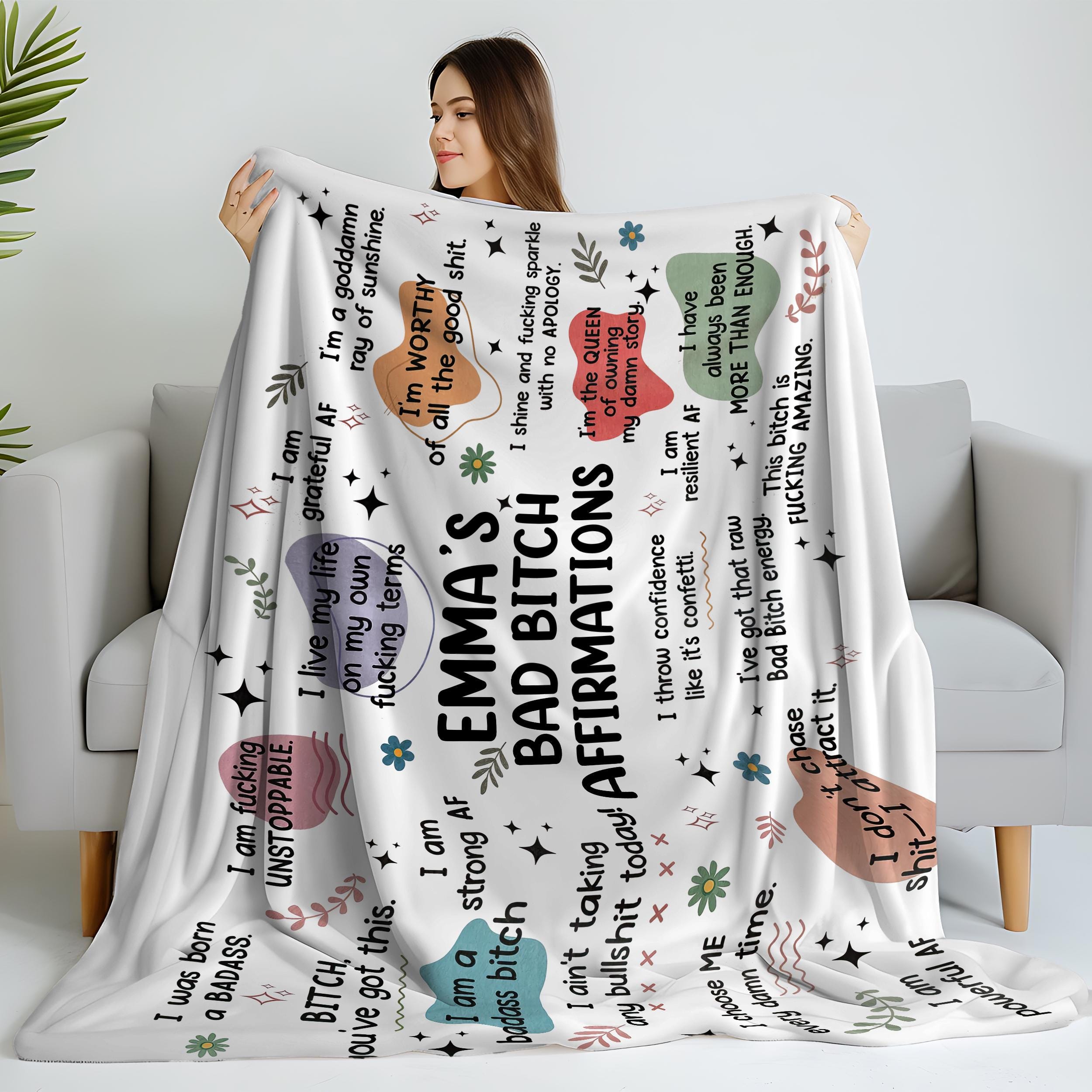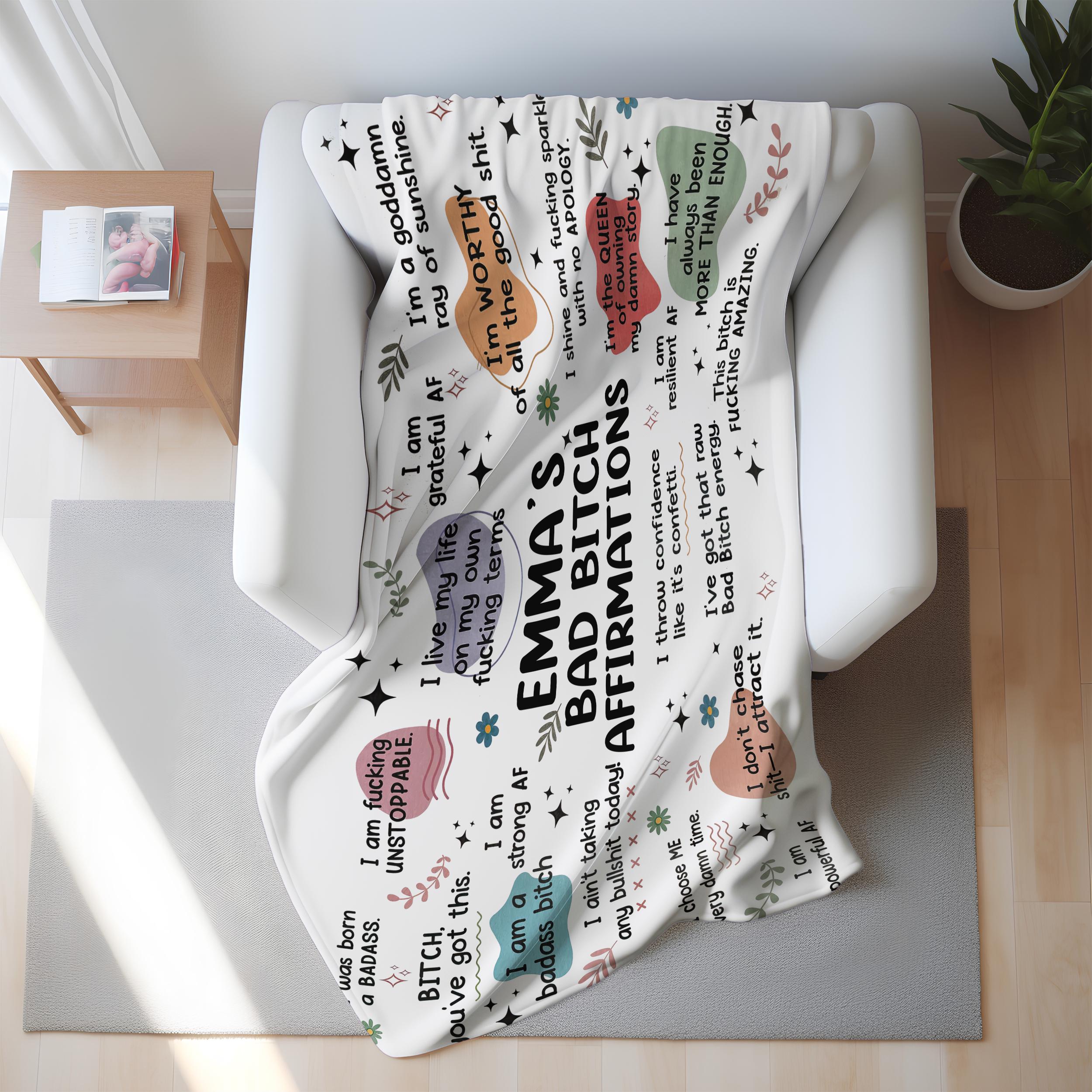 Embrace your inner strength with our Bad B*tch Affirmations Blanket! This personalized wearable blanket features bold and empowering sayings, making it a fun and stylish gift for girls and women. Perfect for birthdays or as a pick-me-up for a friend, this cute blanket offers both comfort and attitude. Whether you're lounging at home or out and about, wrap yourself in motivation and confidence with this unique accessory. Celebrate self-love with a blanket that speaks volumes!