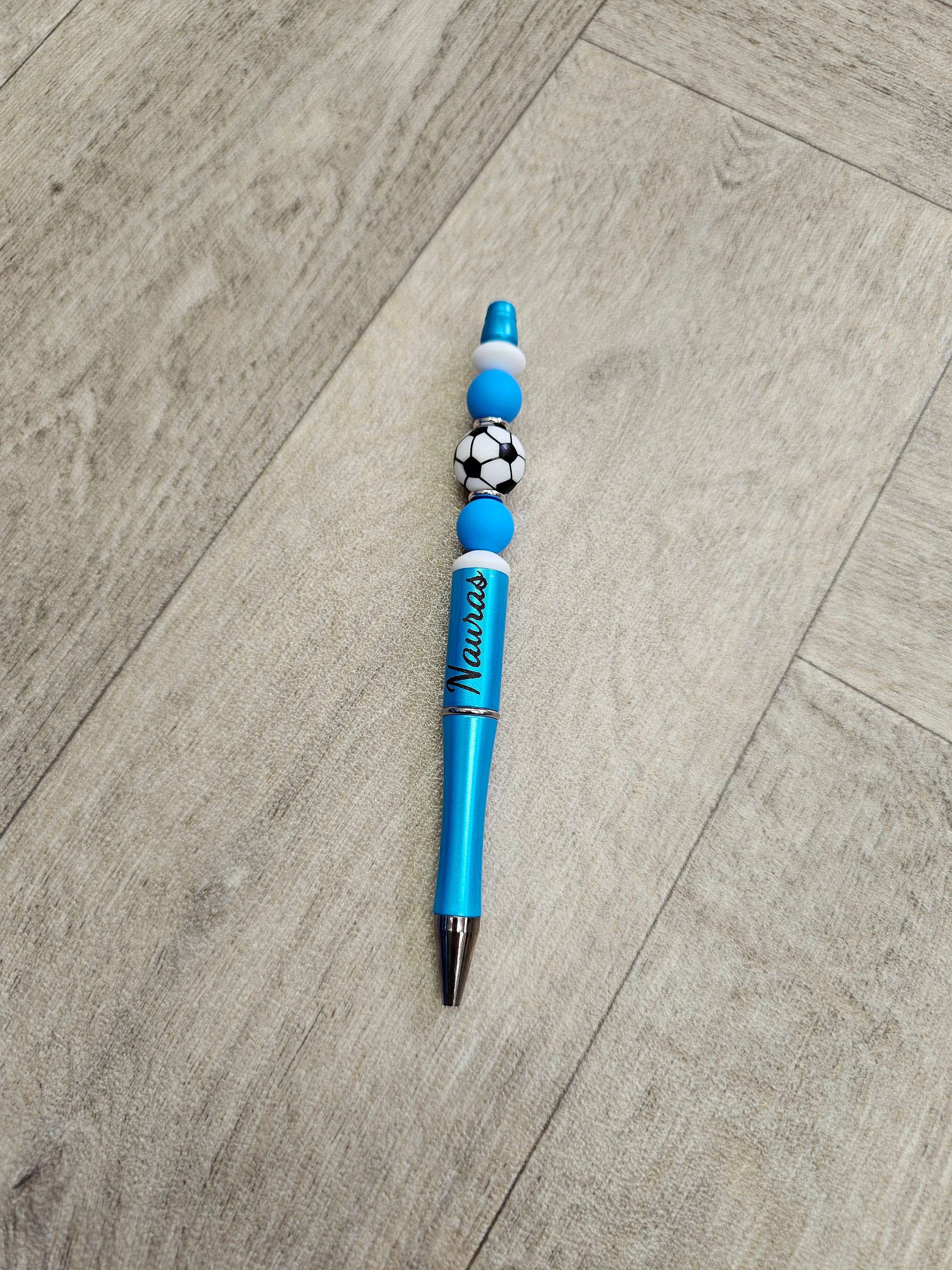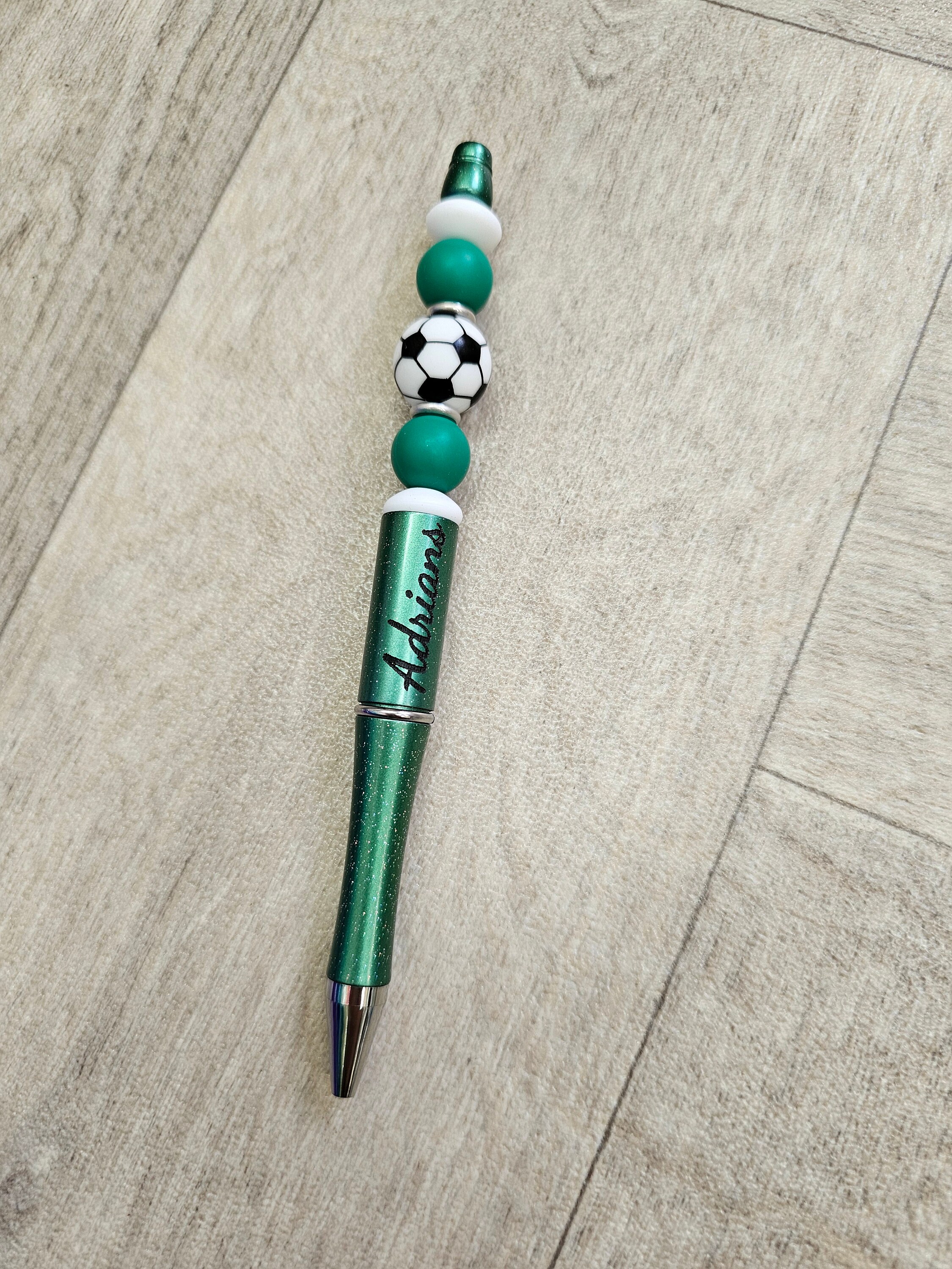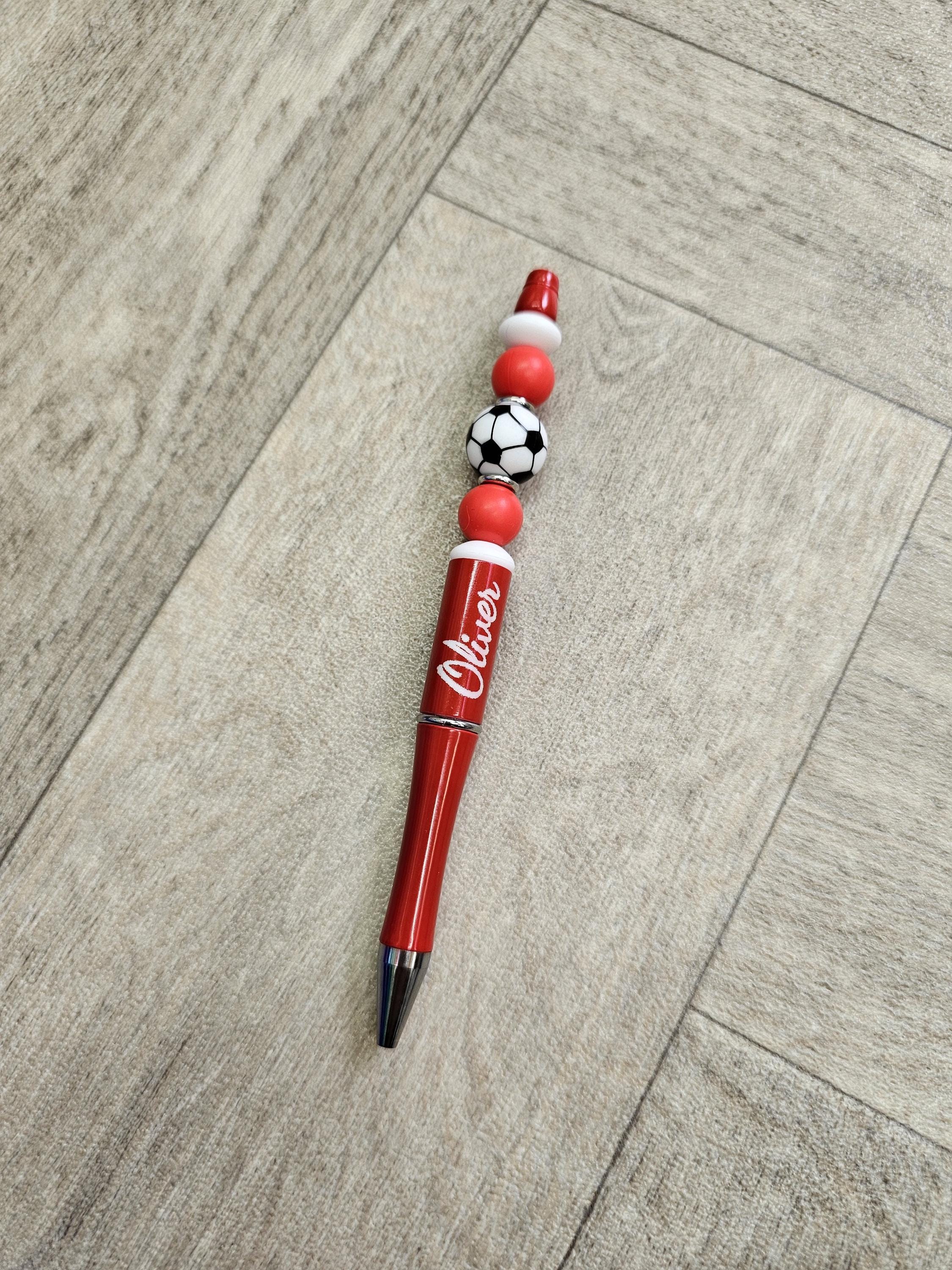 Beaded black ink pen with football charm. Personalised with any name