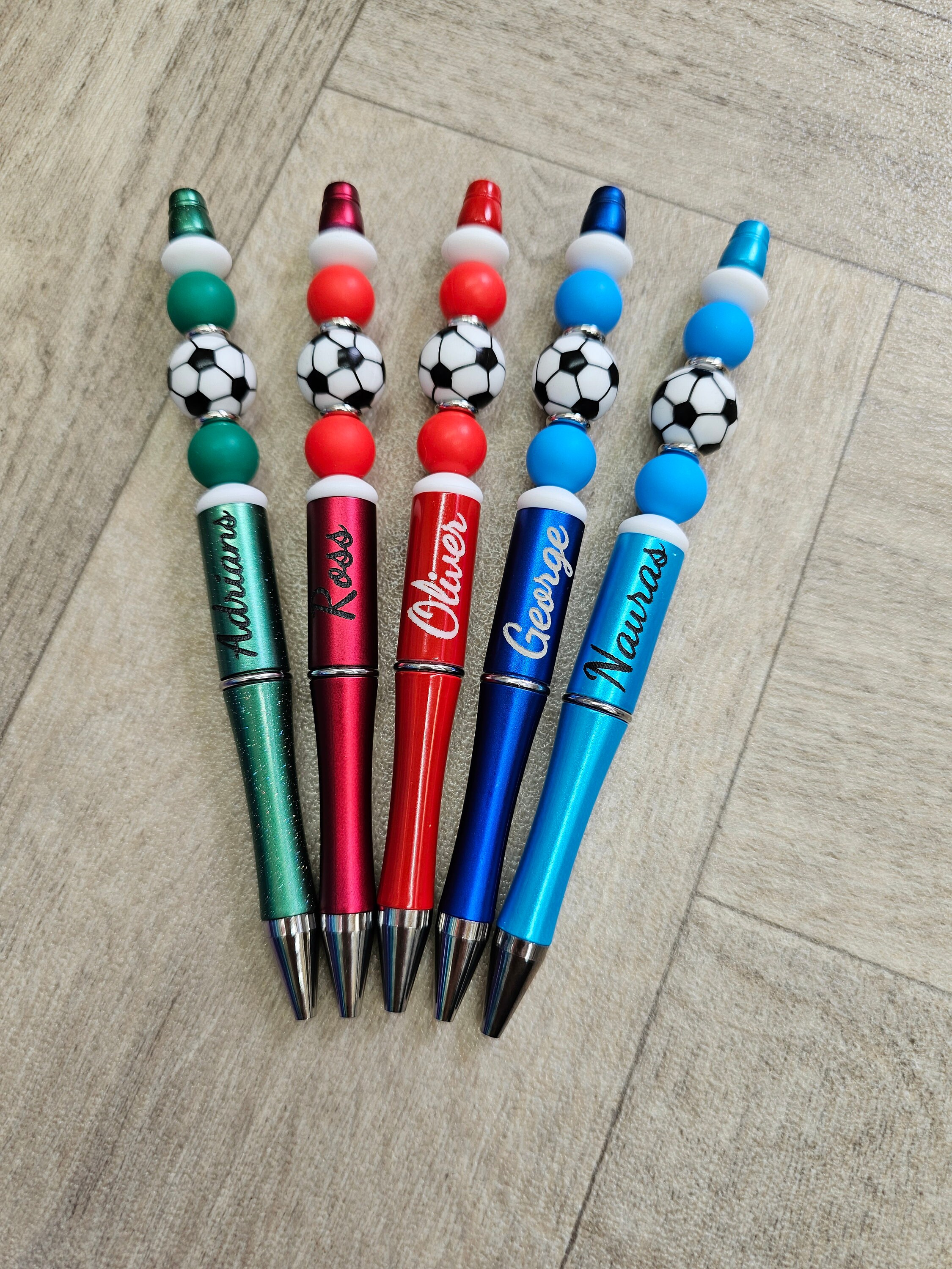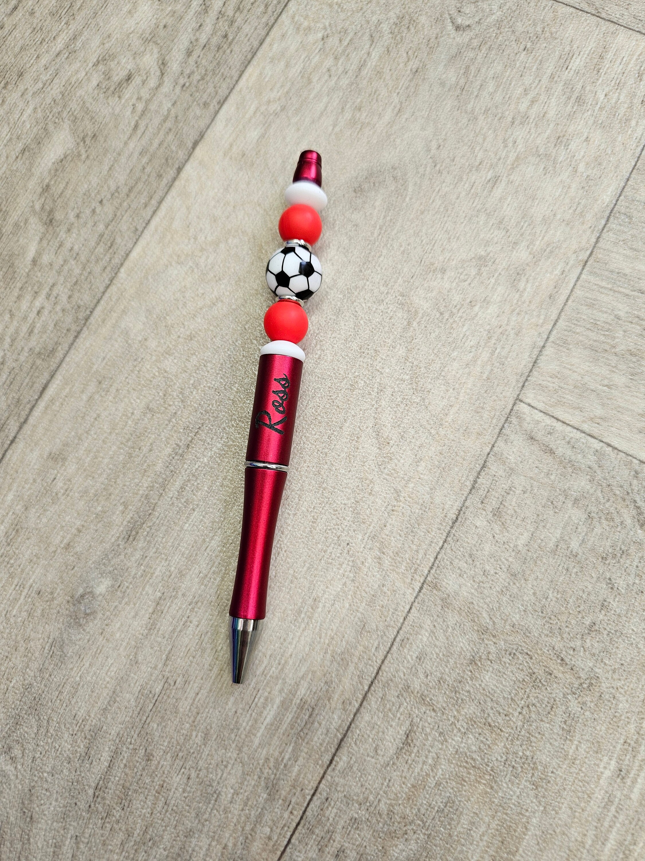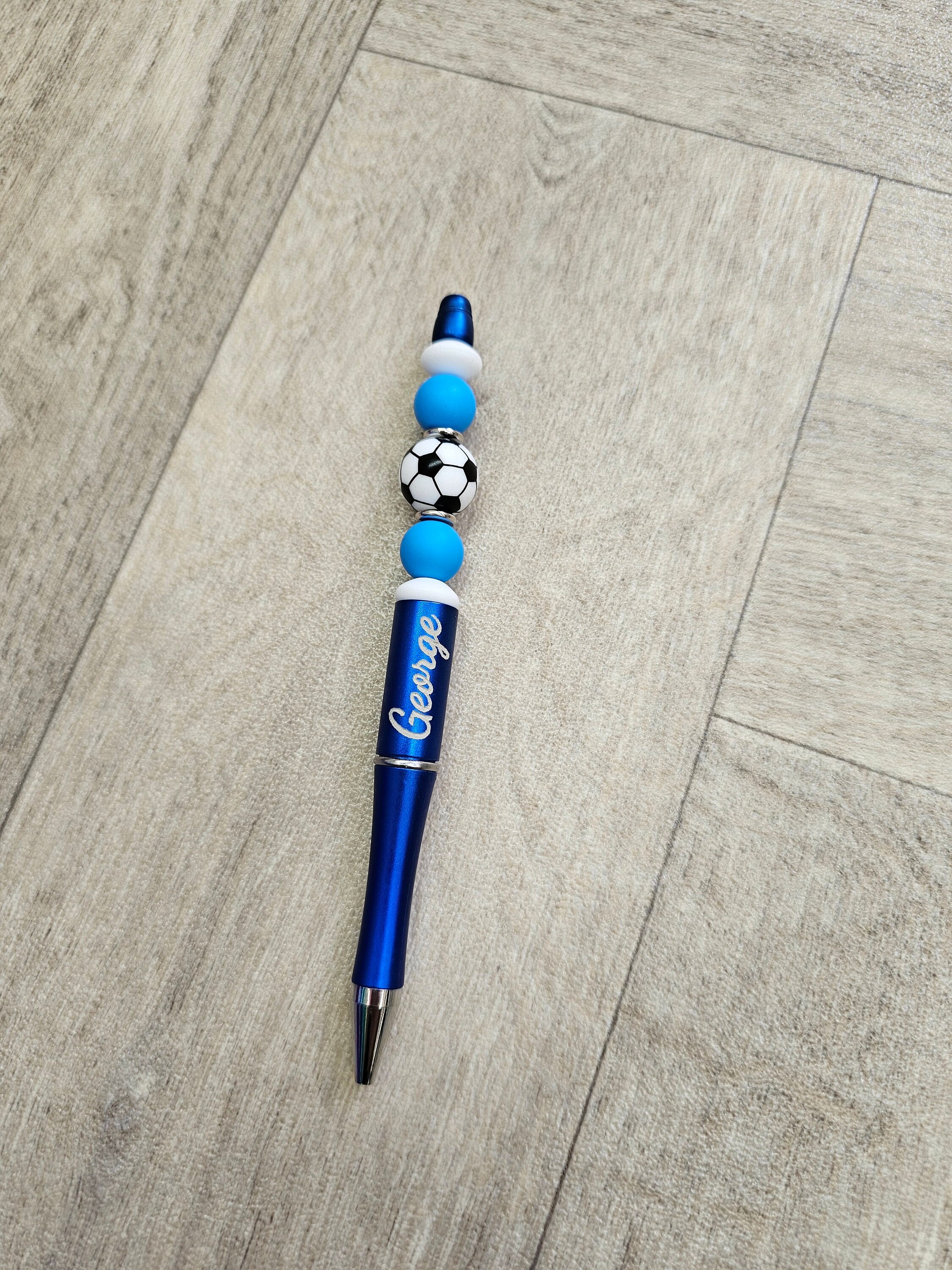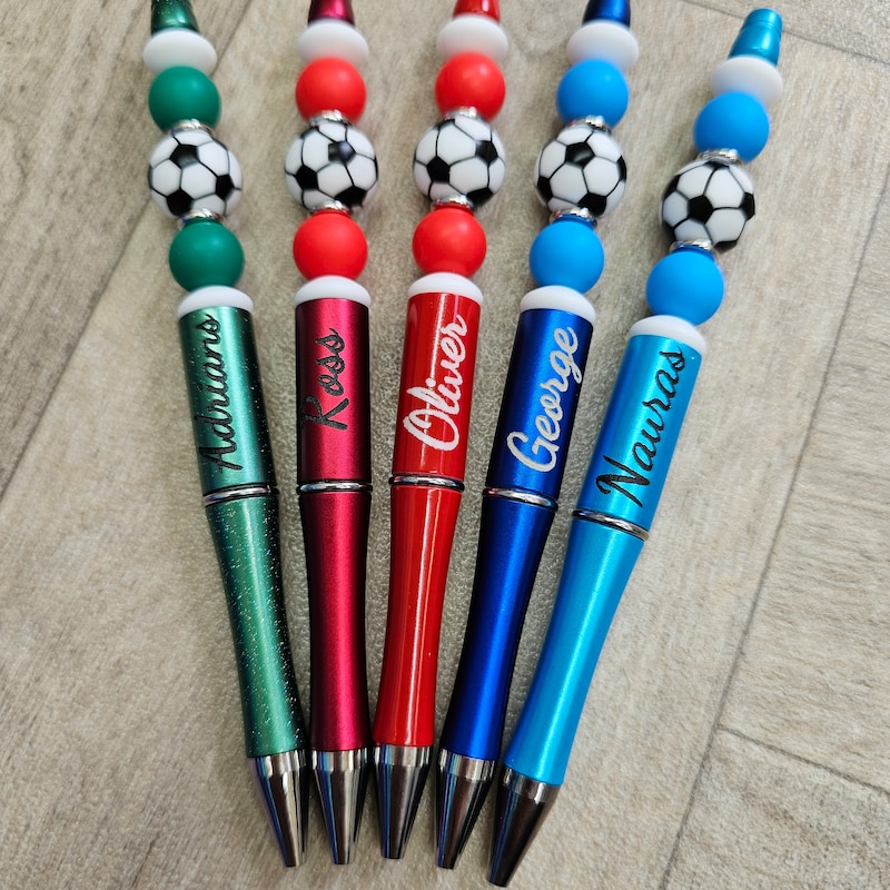 Beaded black ink pen with football charm. Personalised with any name