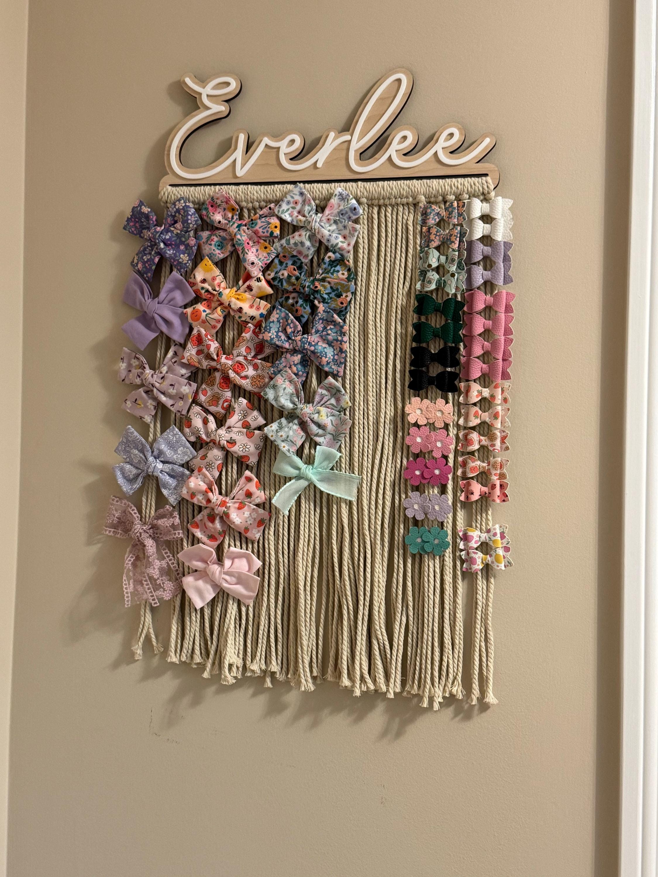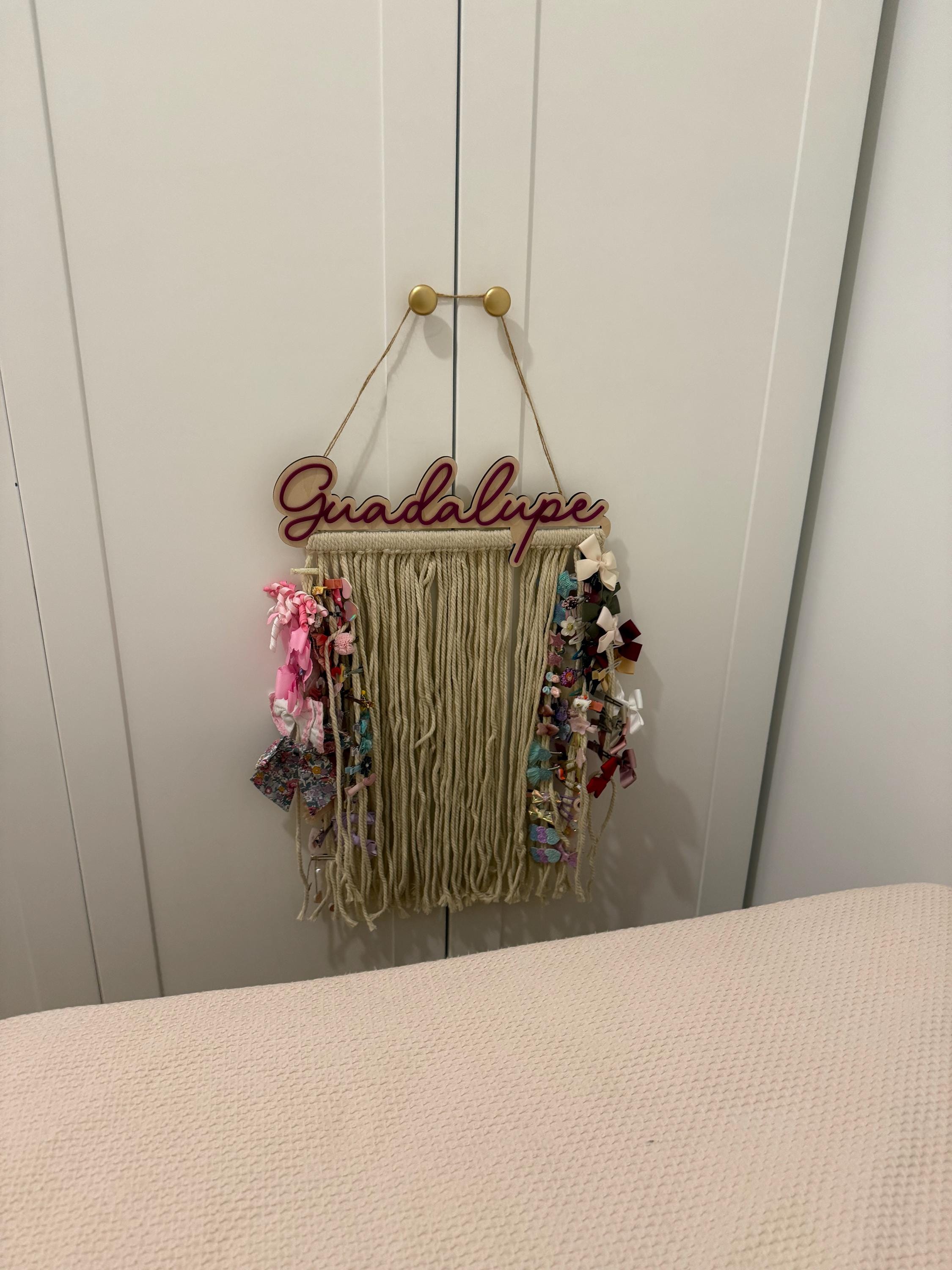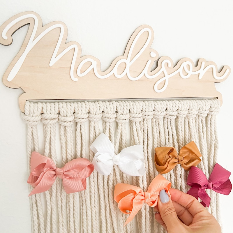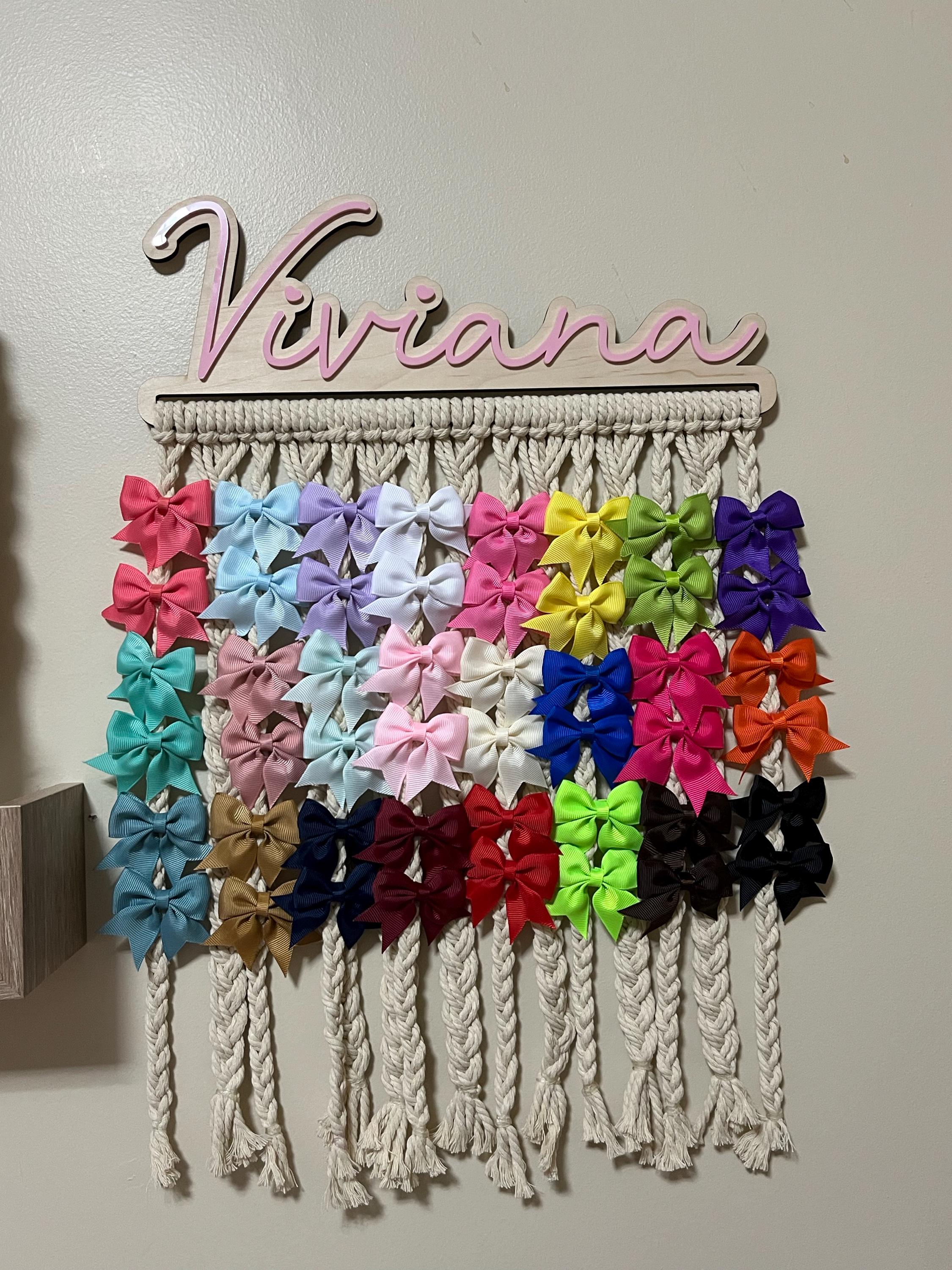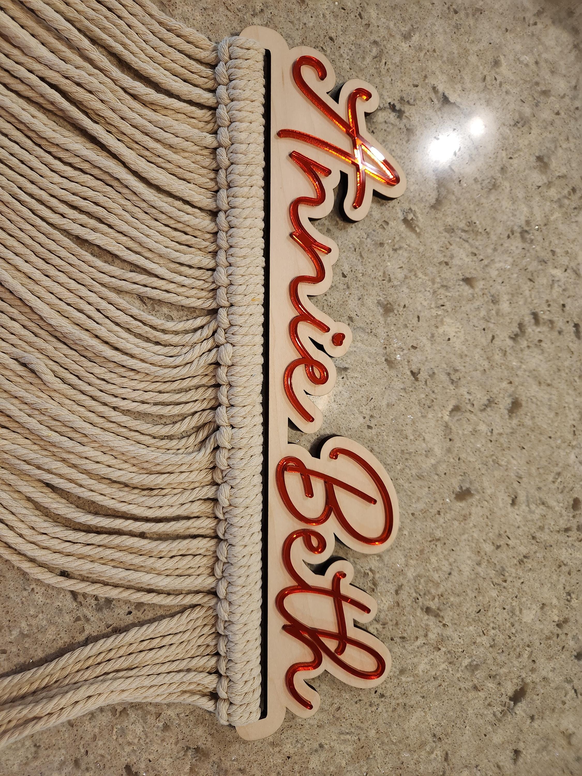 Our personalized macrame bow holder can be a beautiful and functional way to store and display your hair bows hanging on your wall. You can customize it with your favorite color and add your name to make it truly unique. Hang it in your kids bedroom or bathroom for easy access to hair accessories while getting ready.