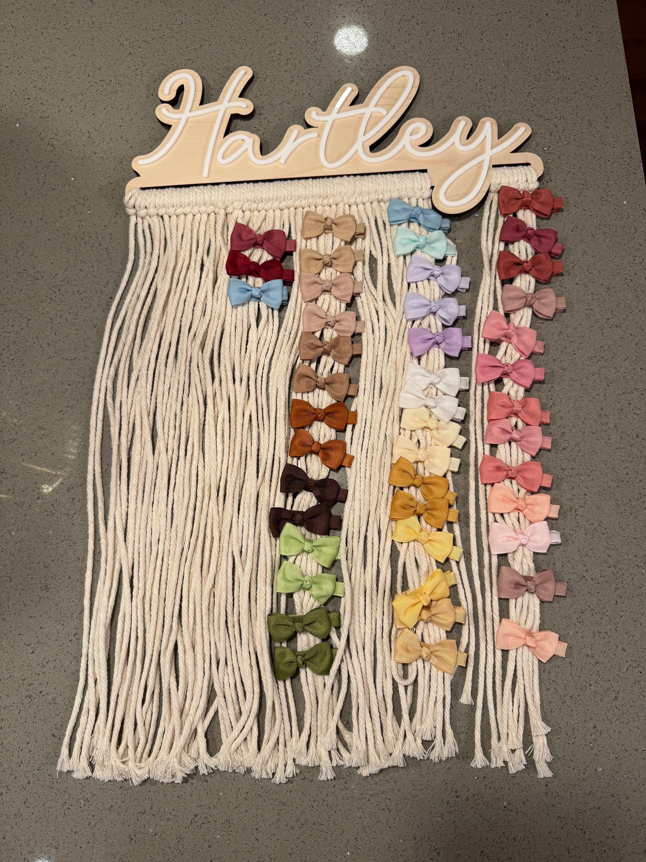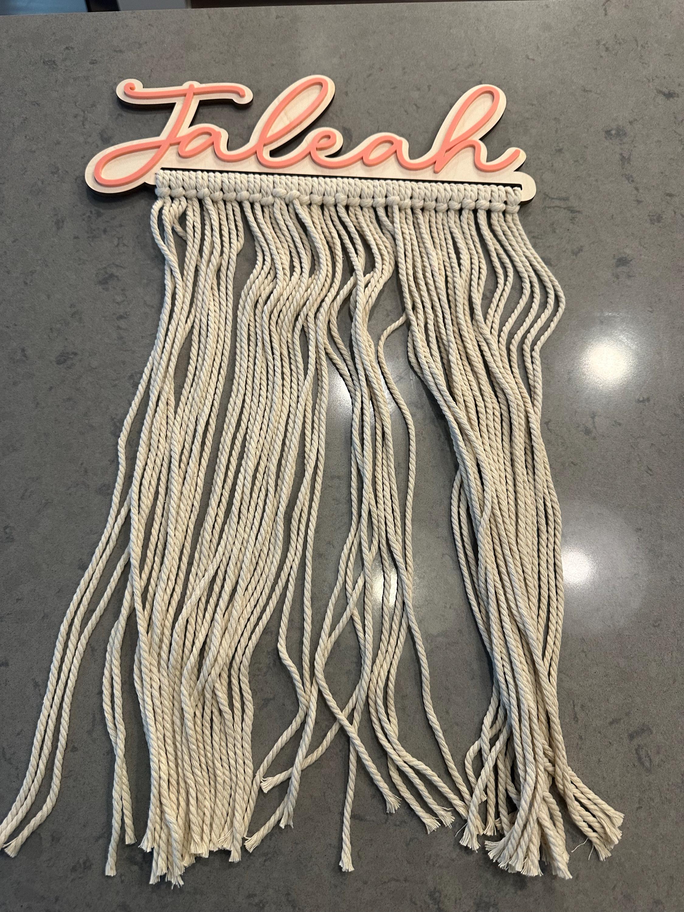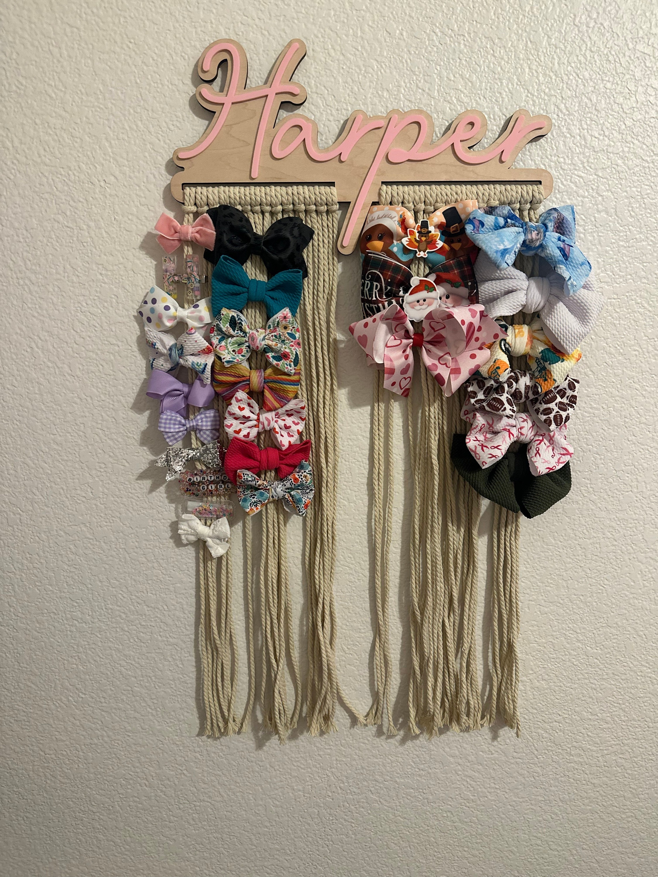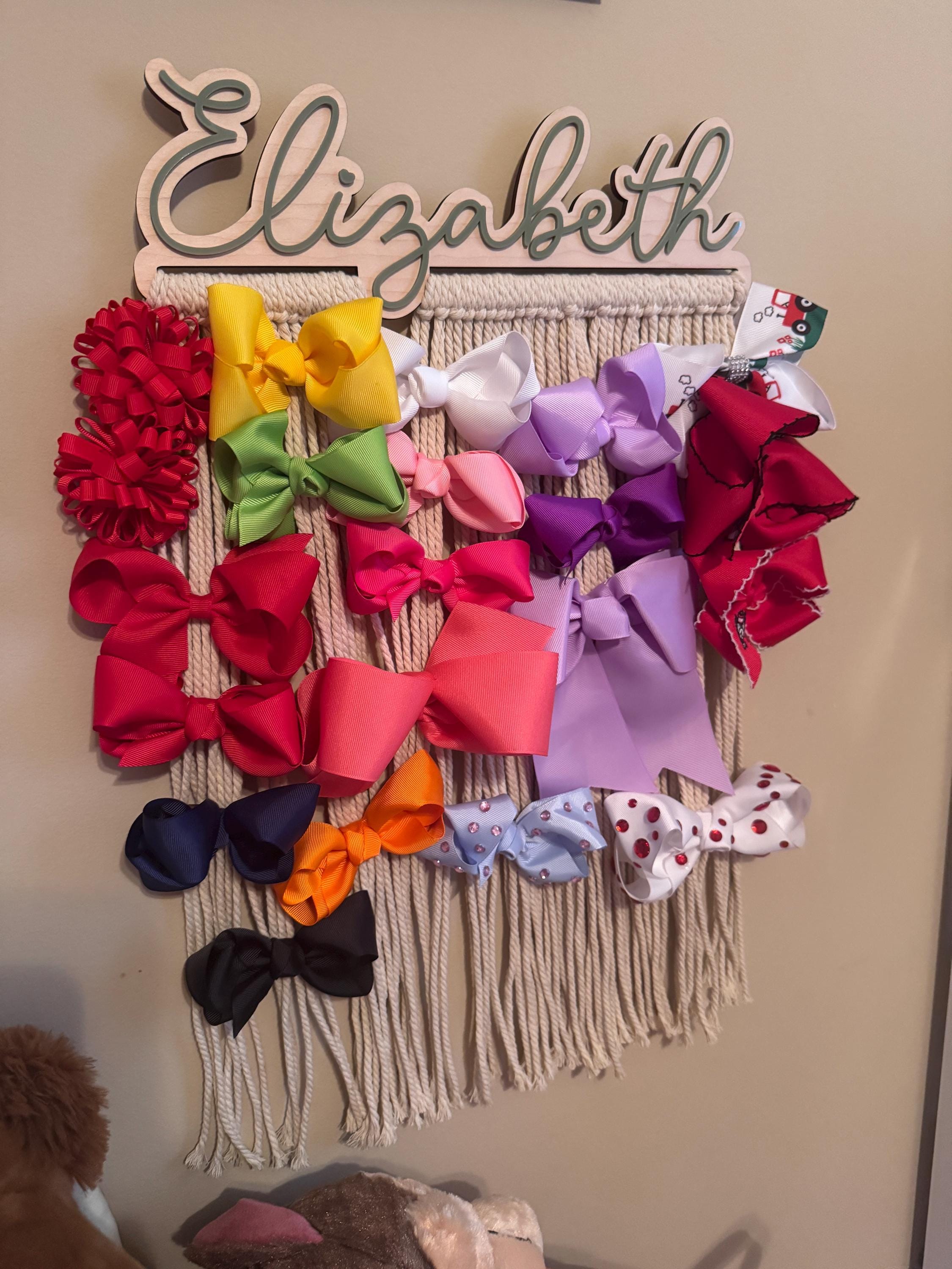 Our personalized macrame bow holder can be a beautiful and functional way to store and display your hair bows hanging on your wall. You can customize it with your favorite color and add your name to make it truly unique. Hang it in your kids bedroom or bathroom for easy access to hair accessories while getting ready.