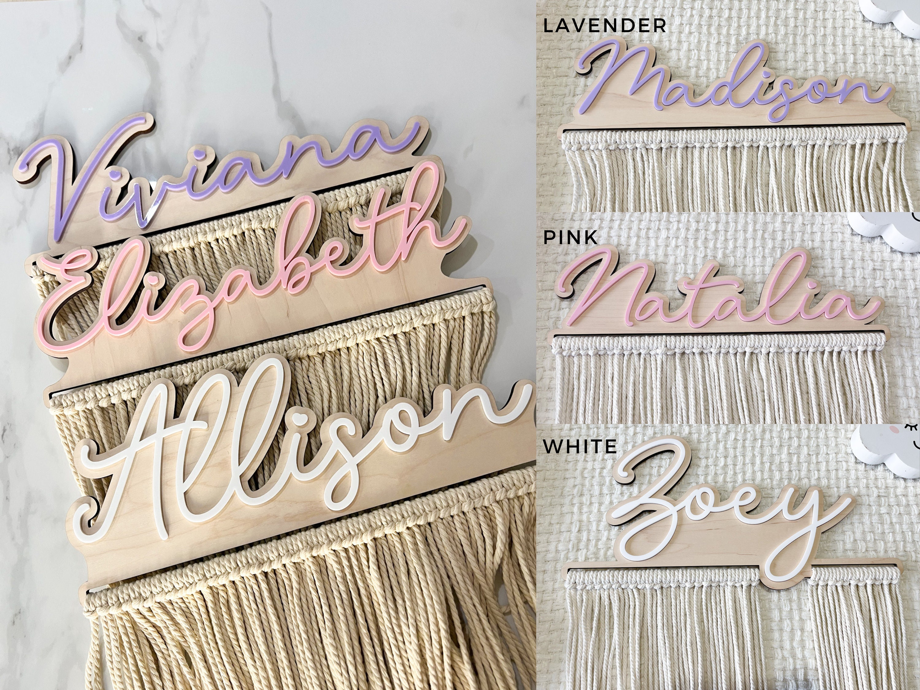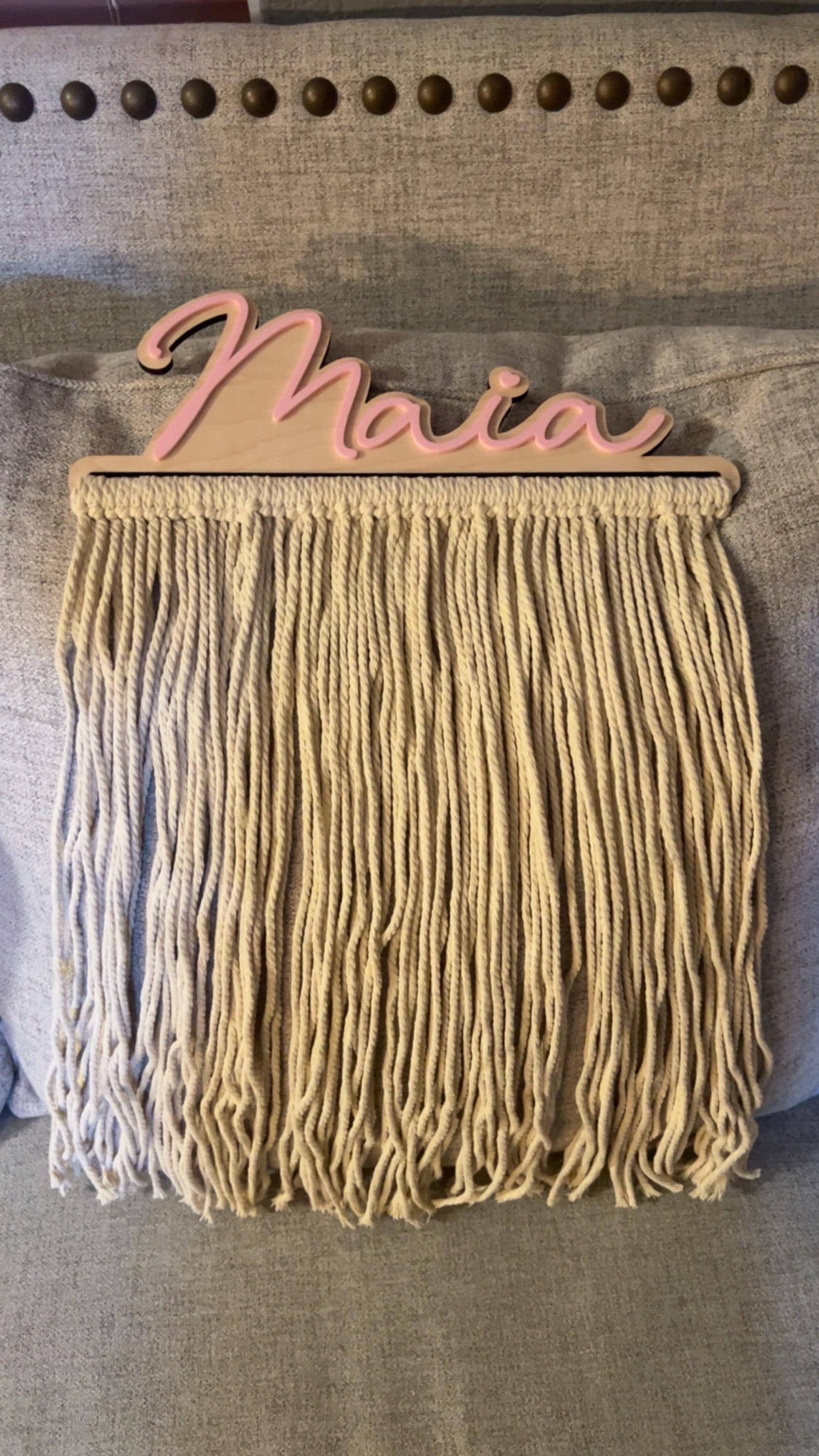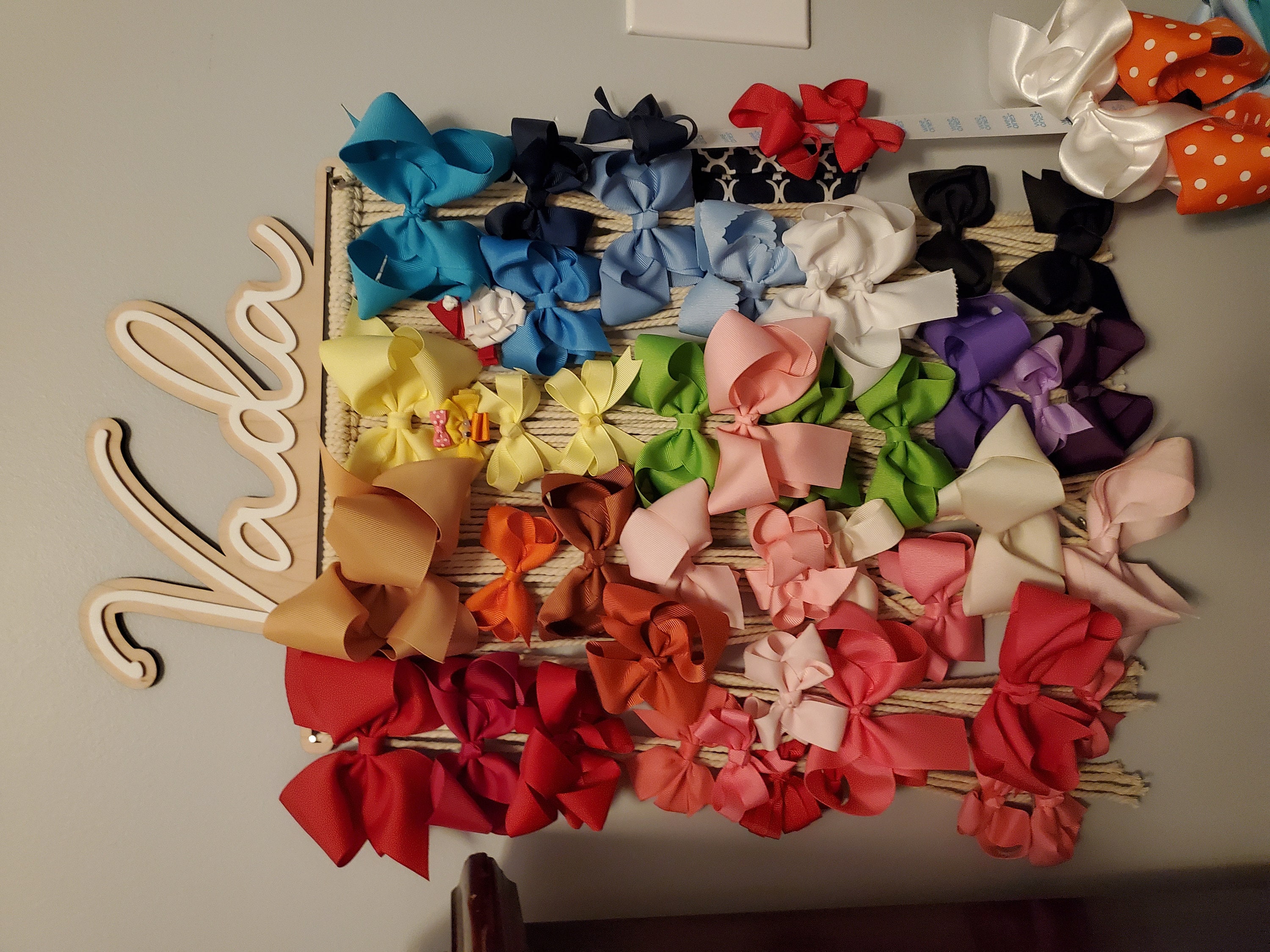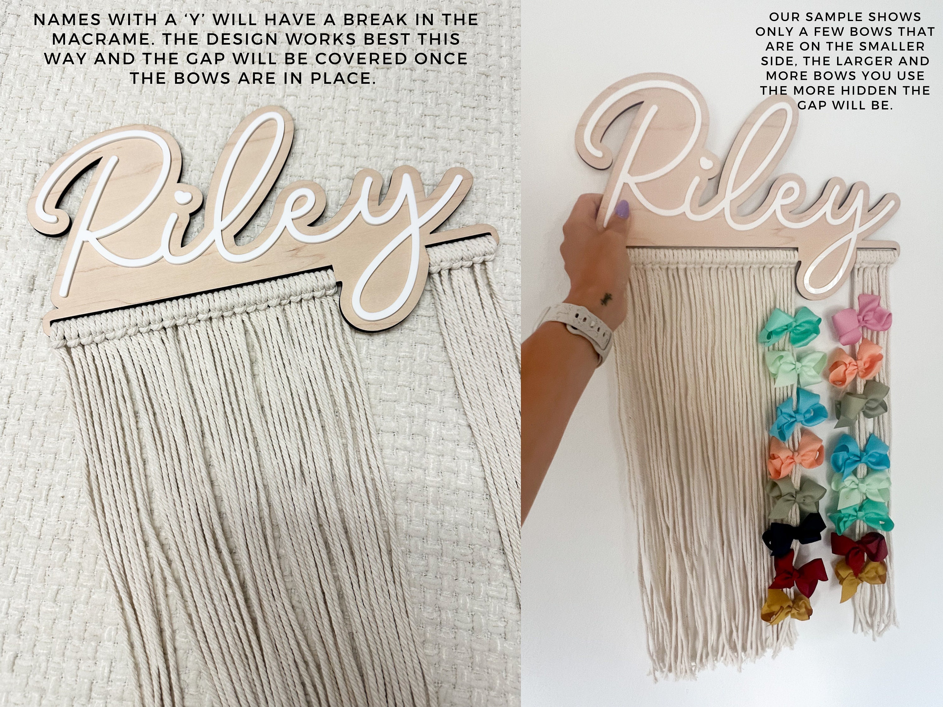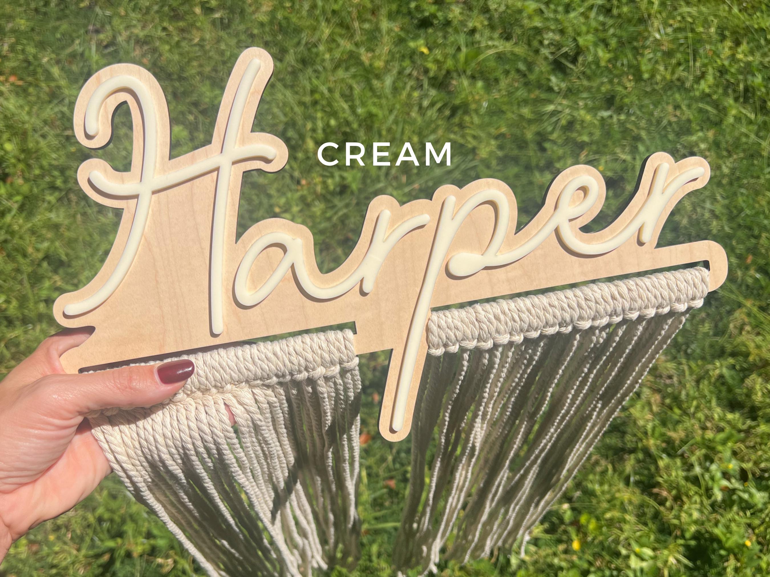 Our personalized macrame bow holder can be a beautiful and functional way to store and display your hair bows hanging on your wall. You can customize it with your favorite color and add your name to make it truly unique. Hang it in your kids bedroom or bathroom for easy access to hair accessories while getting ready.