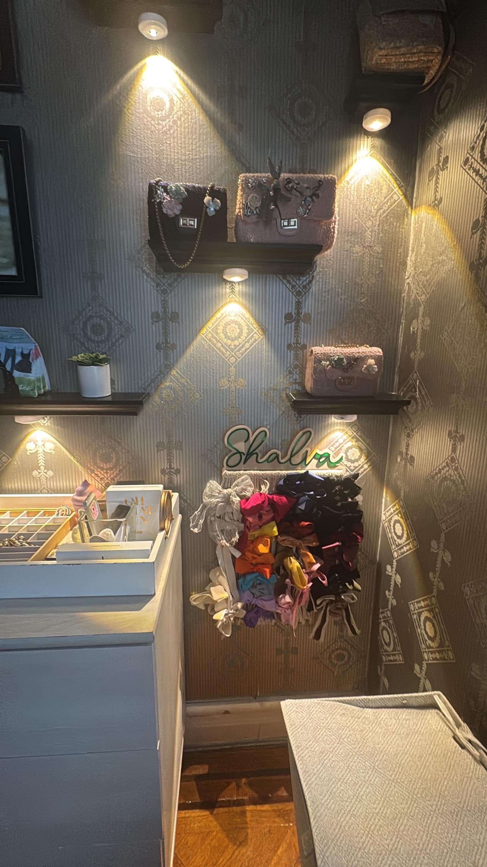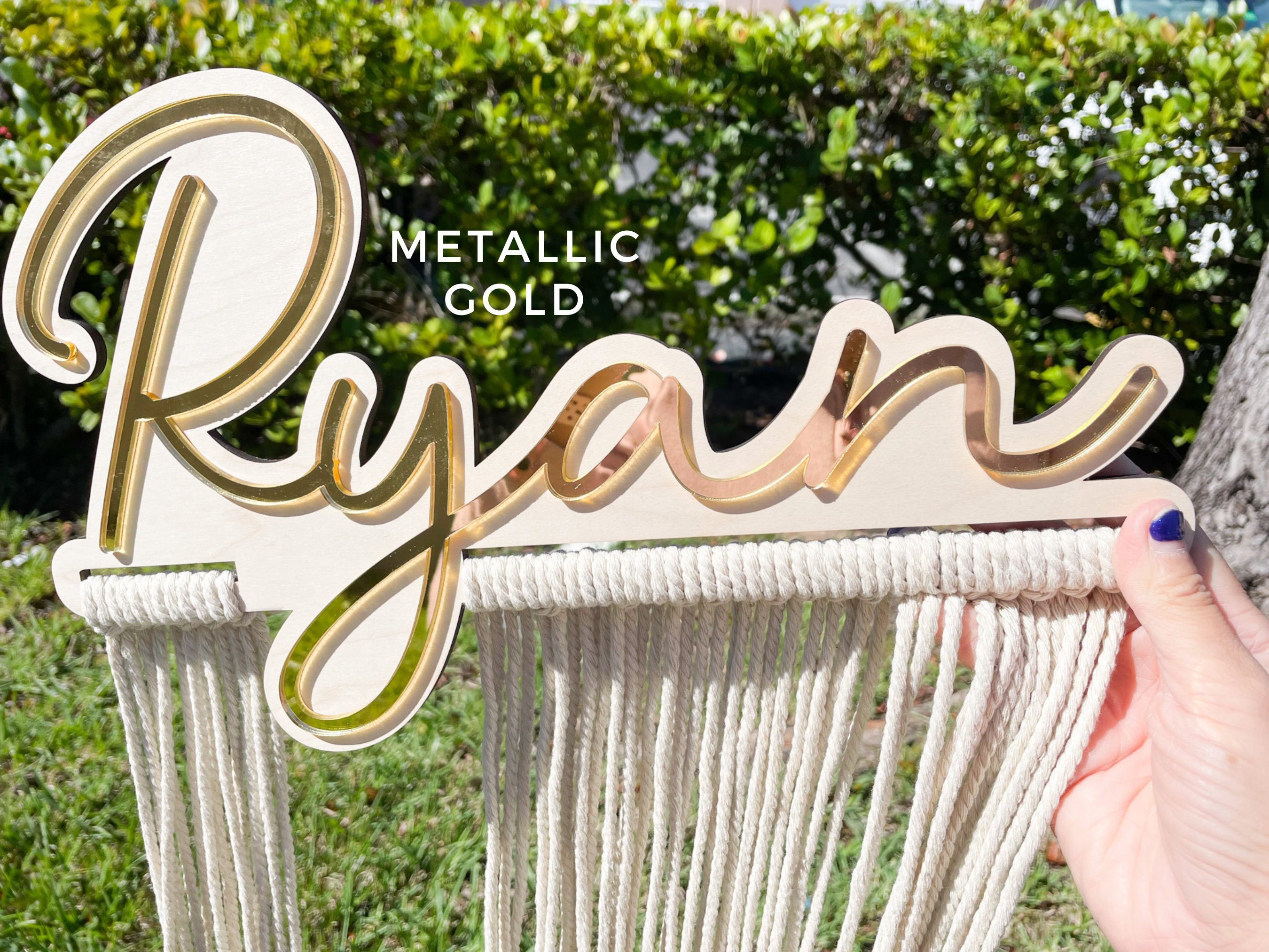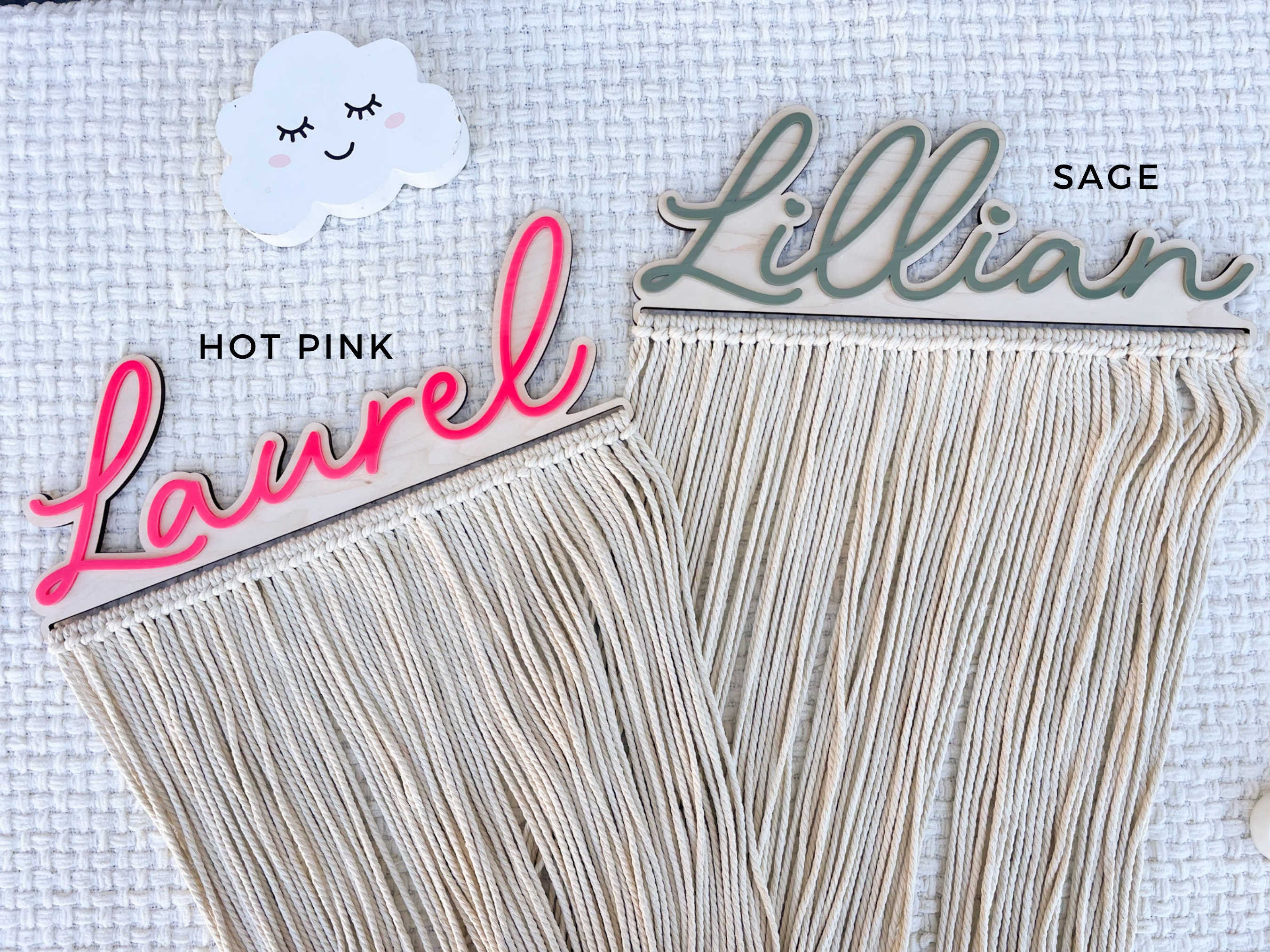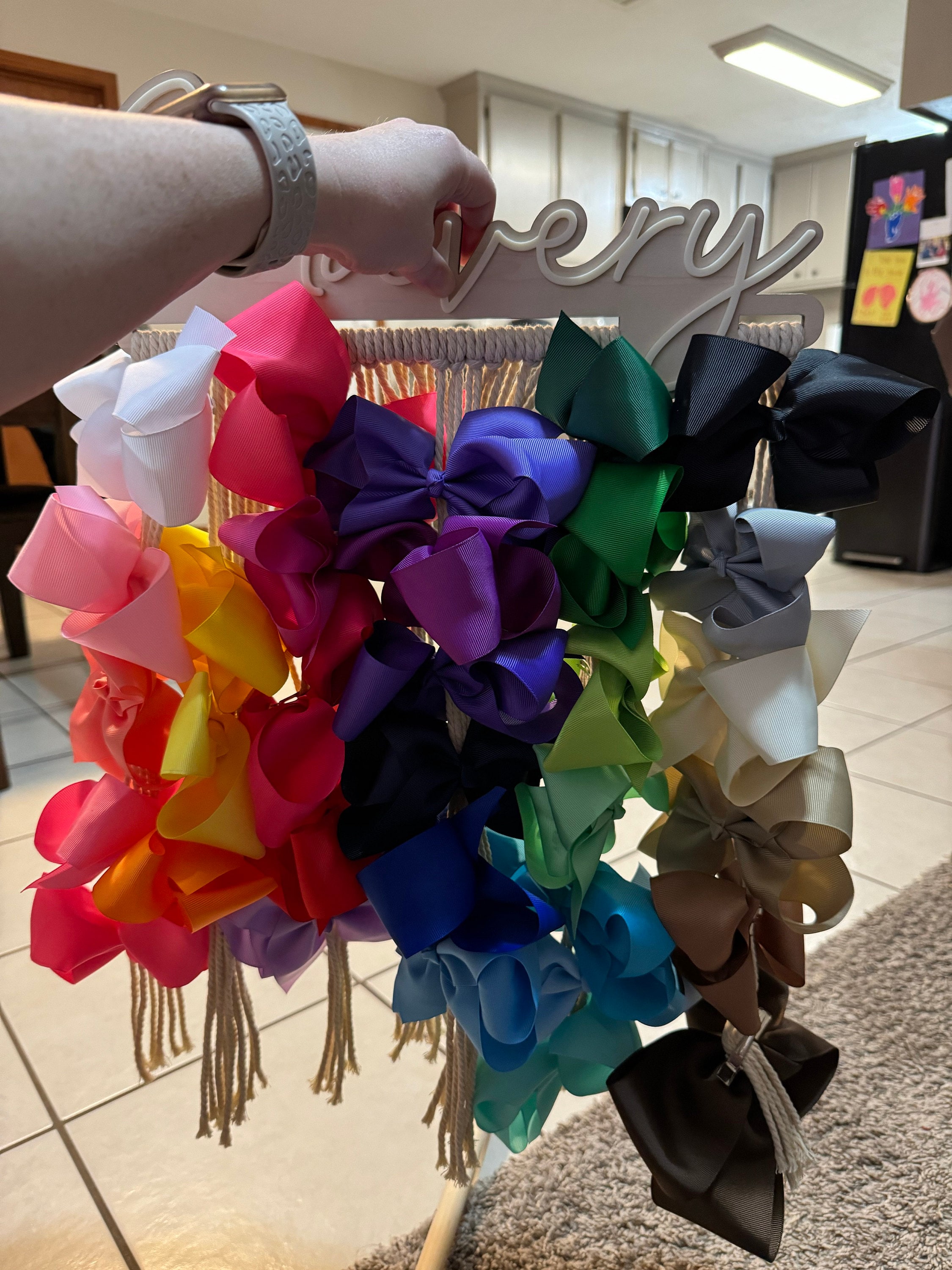 Our personalized macrame bow holder can be a beautiful and functional way to store and display your hair bows hanging on your wall. You can customize it with your favorite color and add your name to make it truly unique. Hang it in your kids bedroom or bathroom for easy access to hair accessories while getting ready.