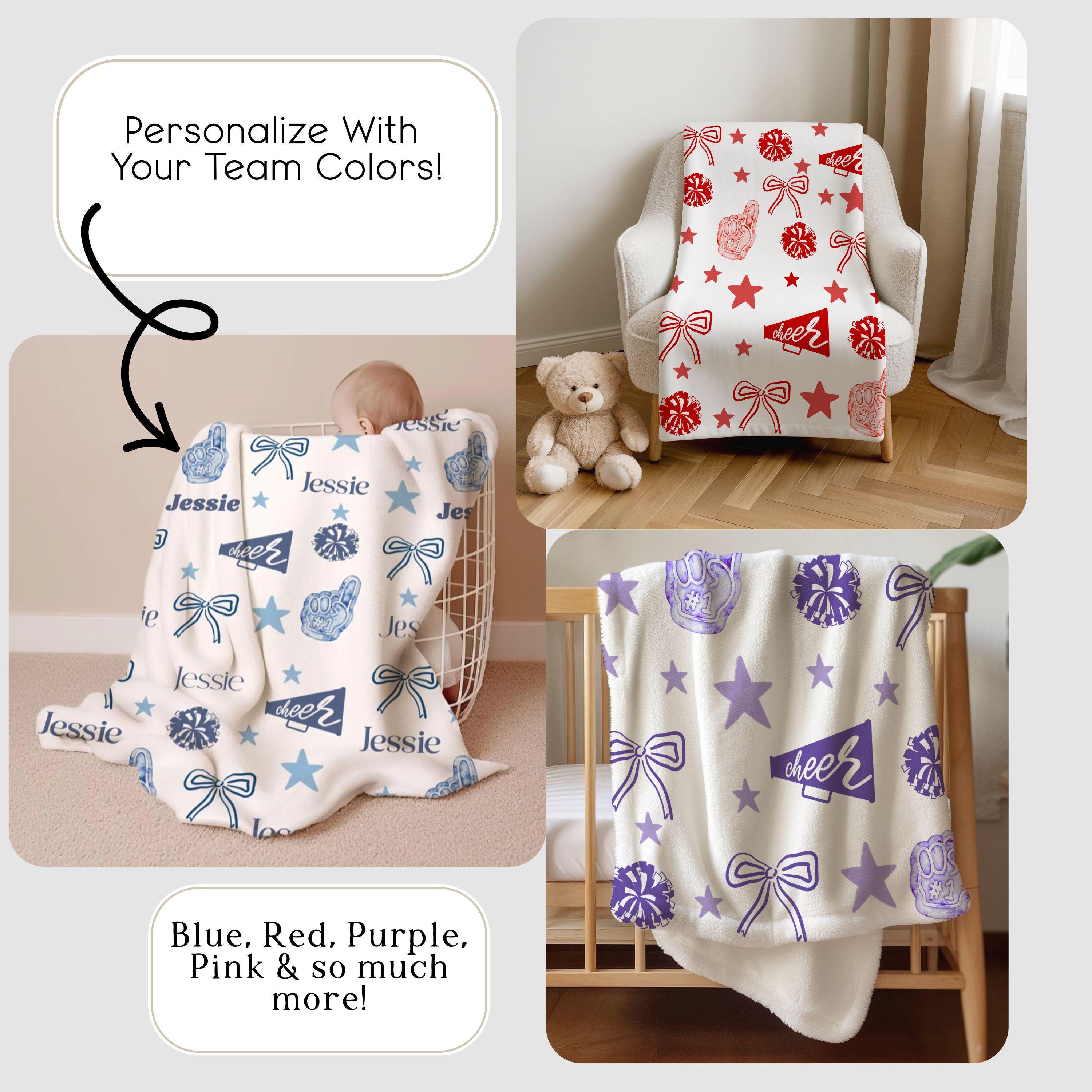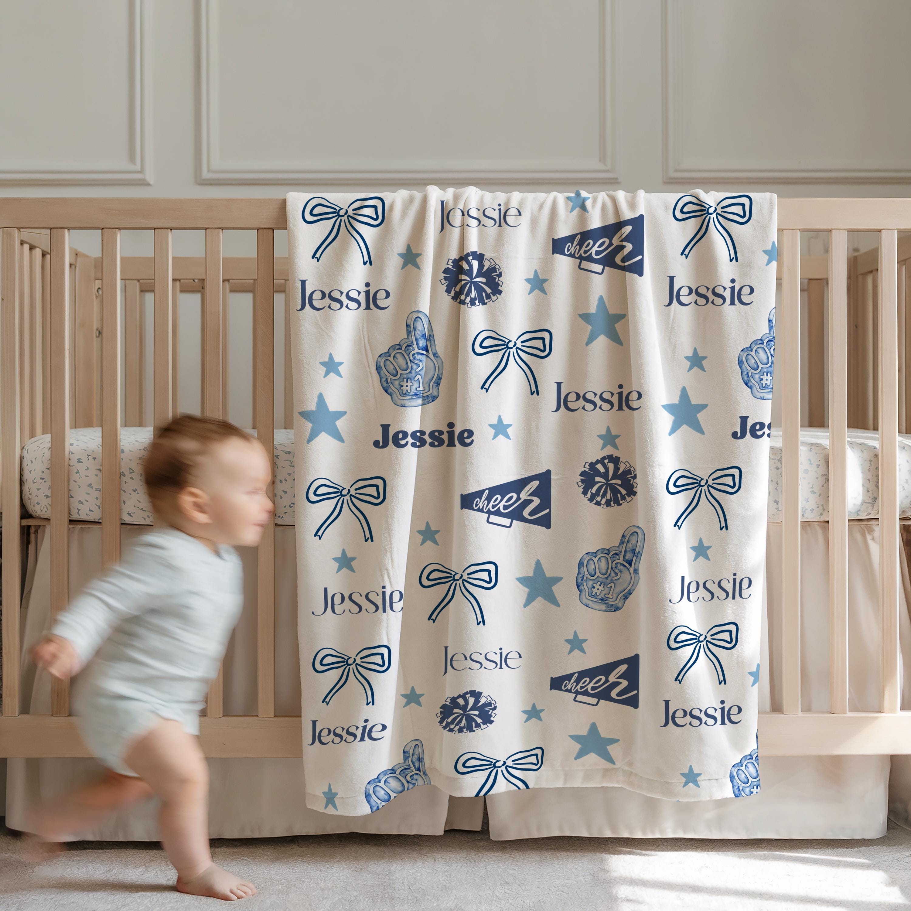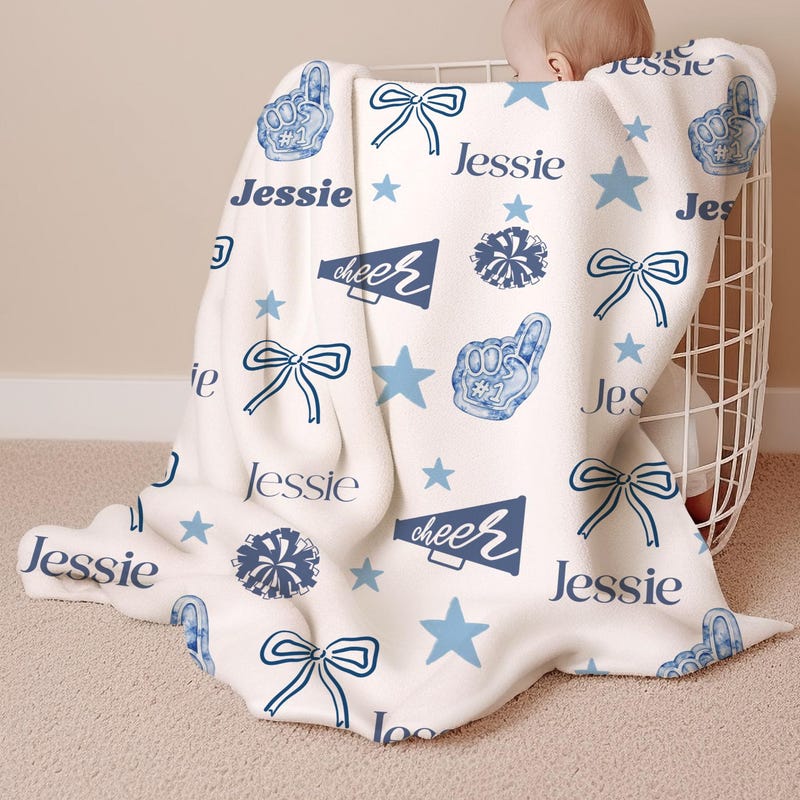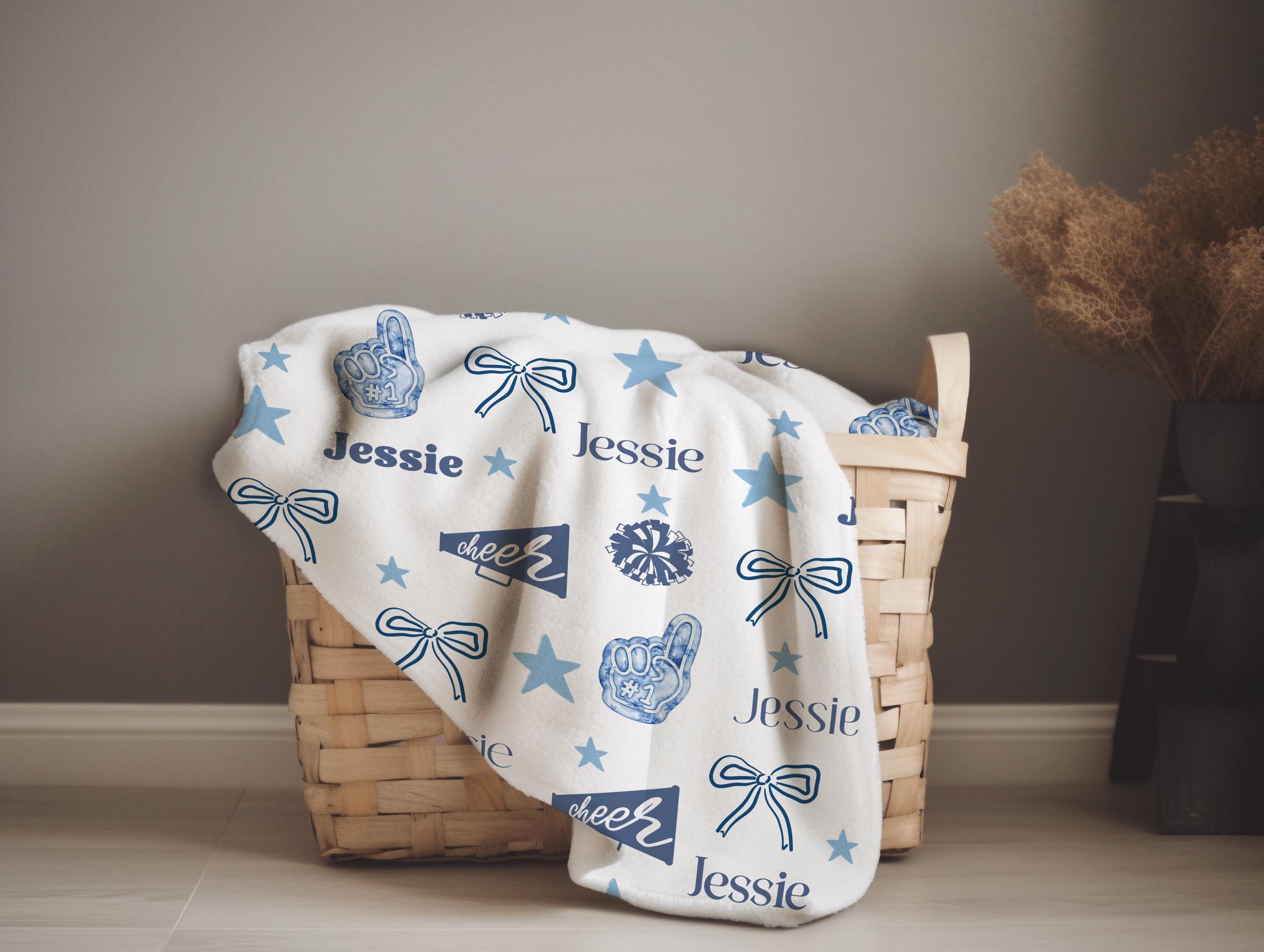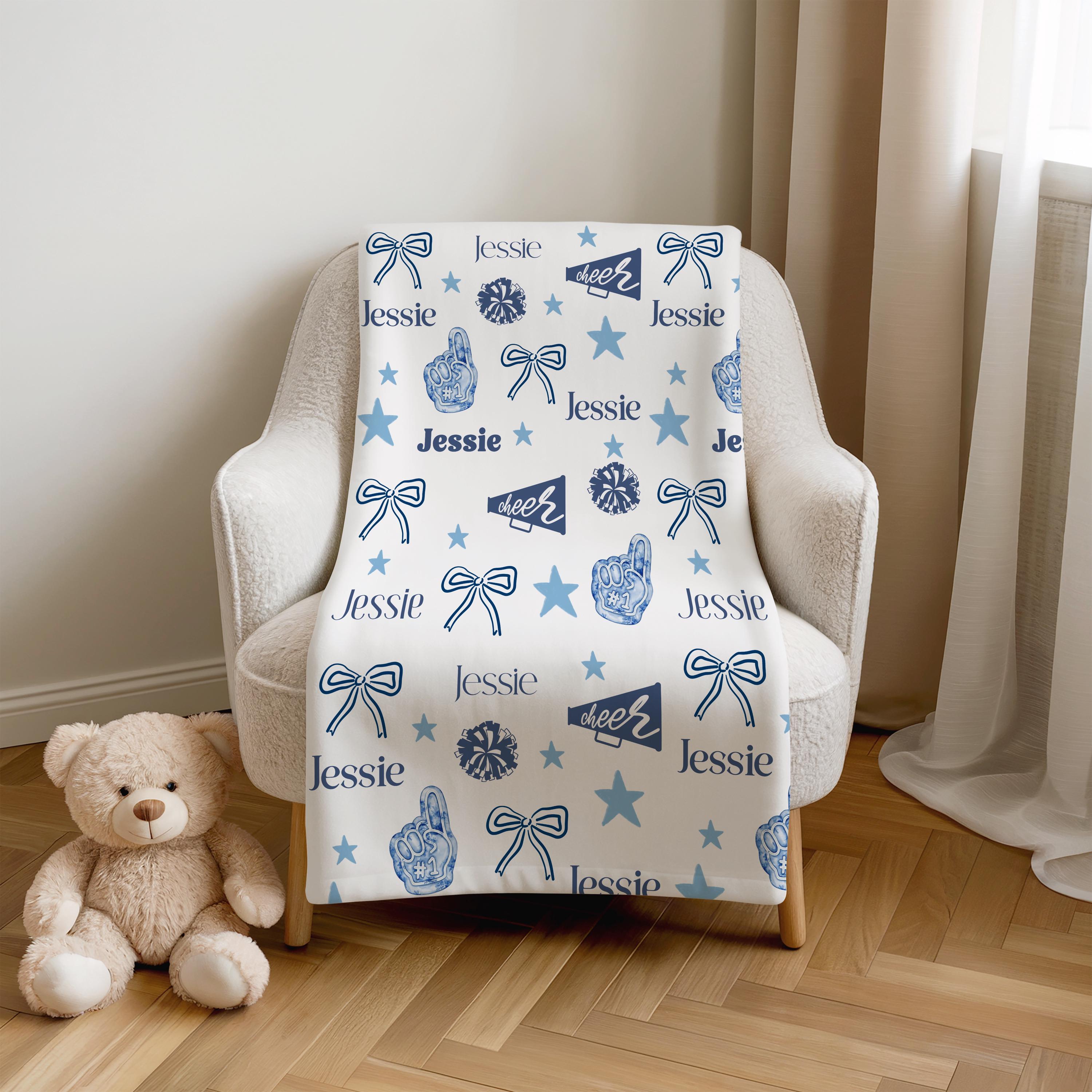 This cheer blanket is a perfect and beautiful personalized girl blanket, featuring custom name design with megaphone and pom pom details. this cozy cheerleader gift makes a thoughtful team blanket for the stadium and a unique keepsake for any cheer fan.