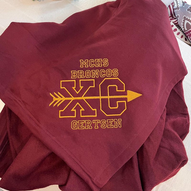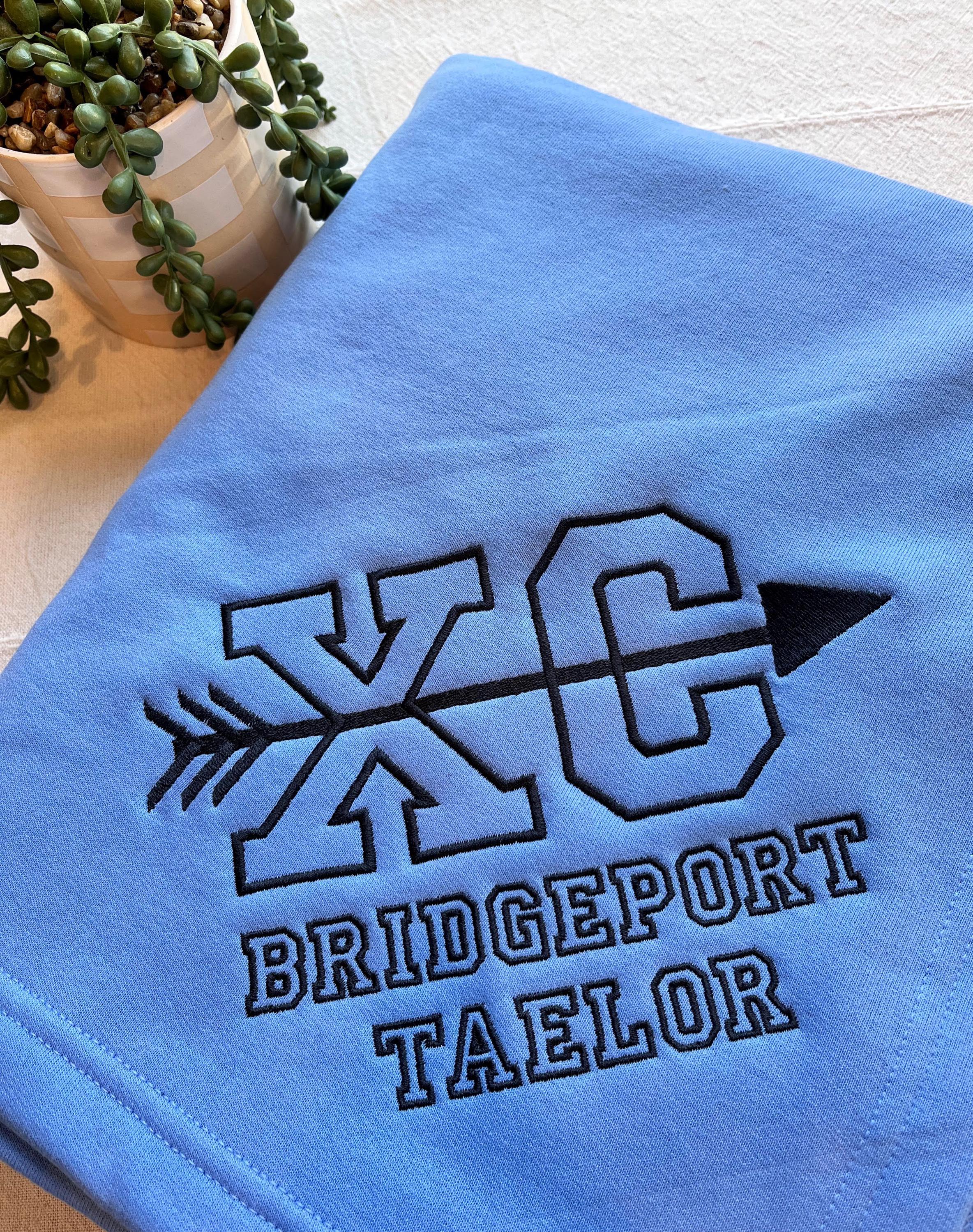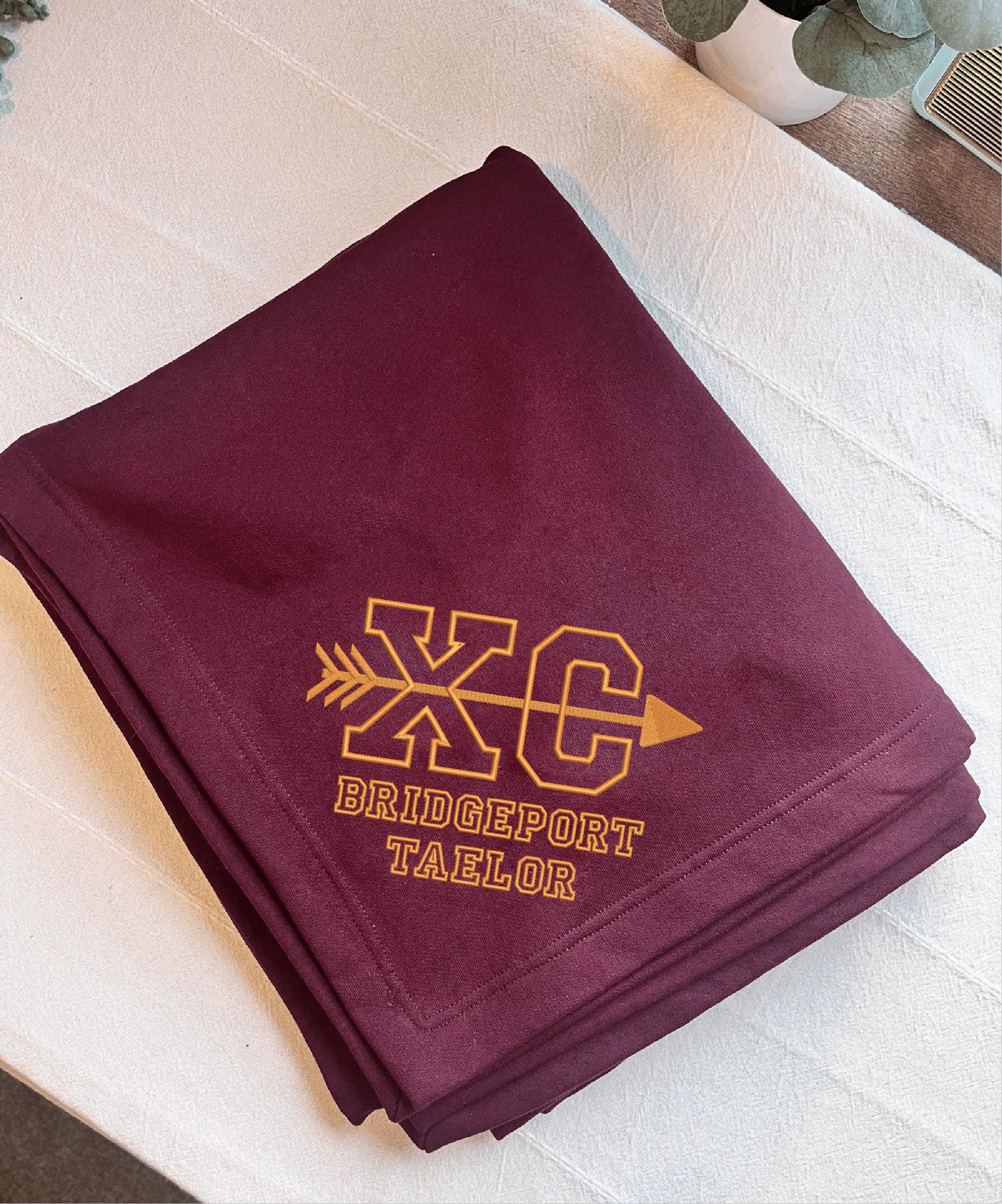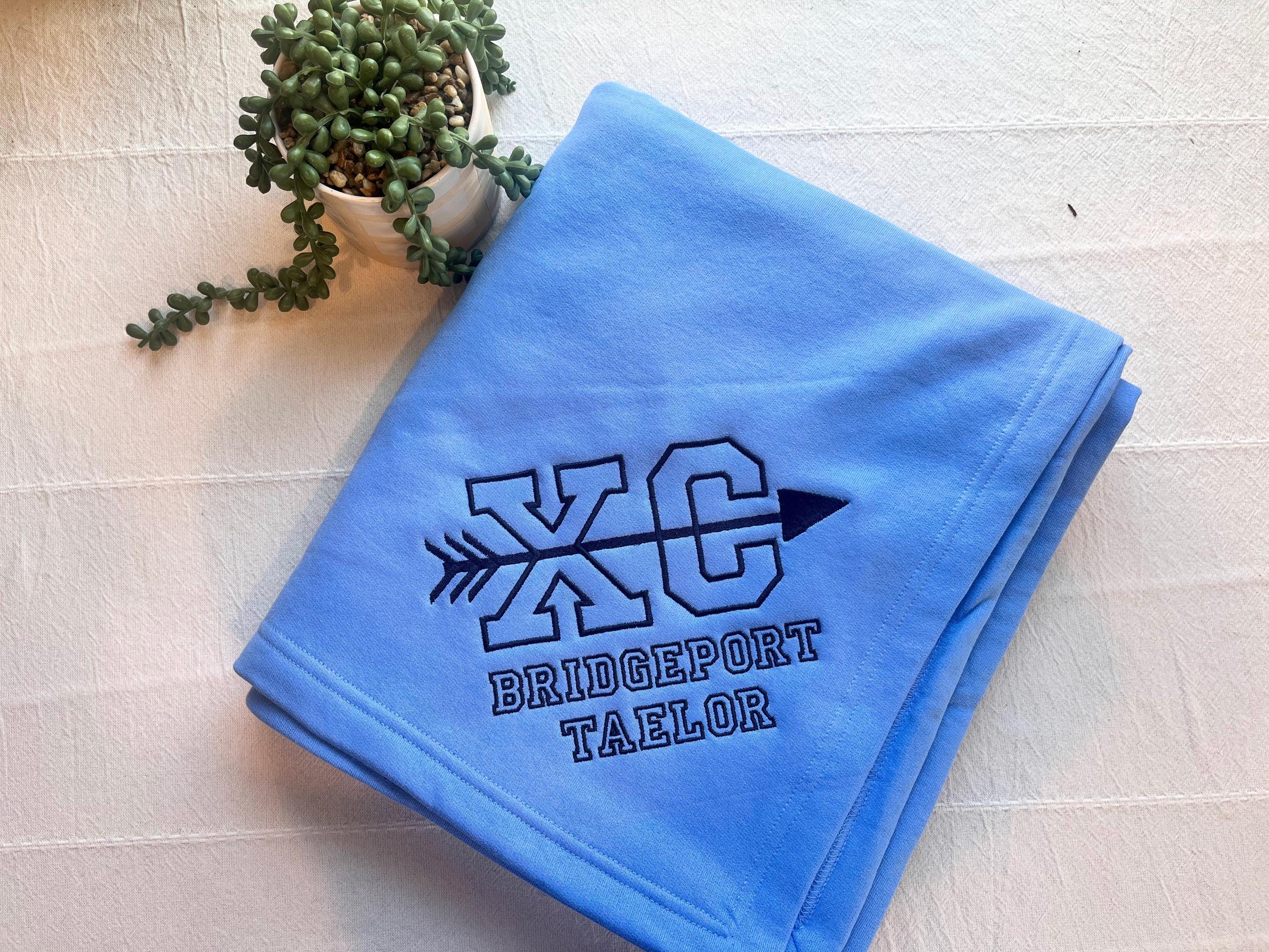 Custom XC Cross Country Stadium Sweatshirt Blanket. These blankets are so soft and can be customized for your loved one! Stay warm and cozy at cross country meets this Fall with this personalized blanket. This also makes a great gift for teams, seniors, and clubs. The size of the text will vary depending on the number of characters.