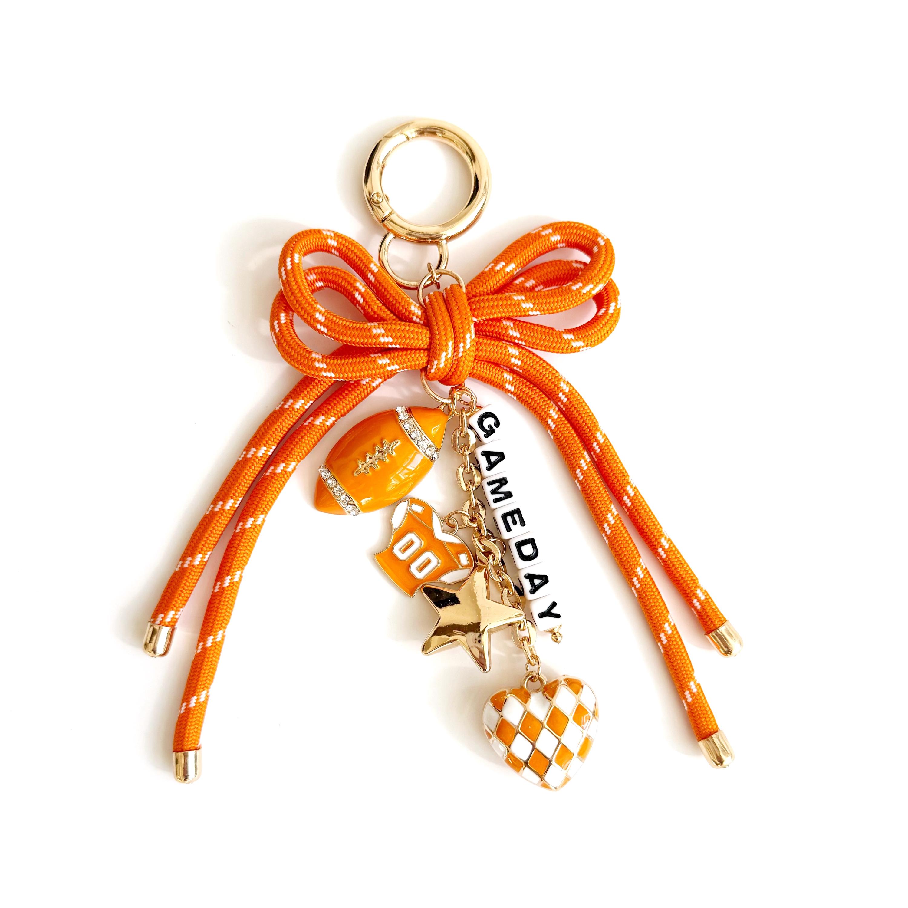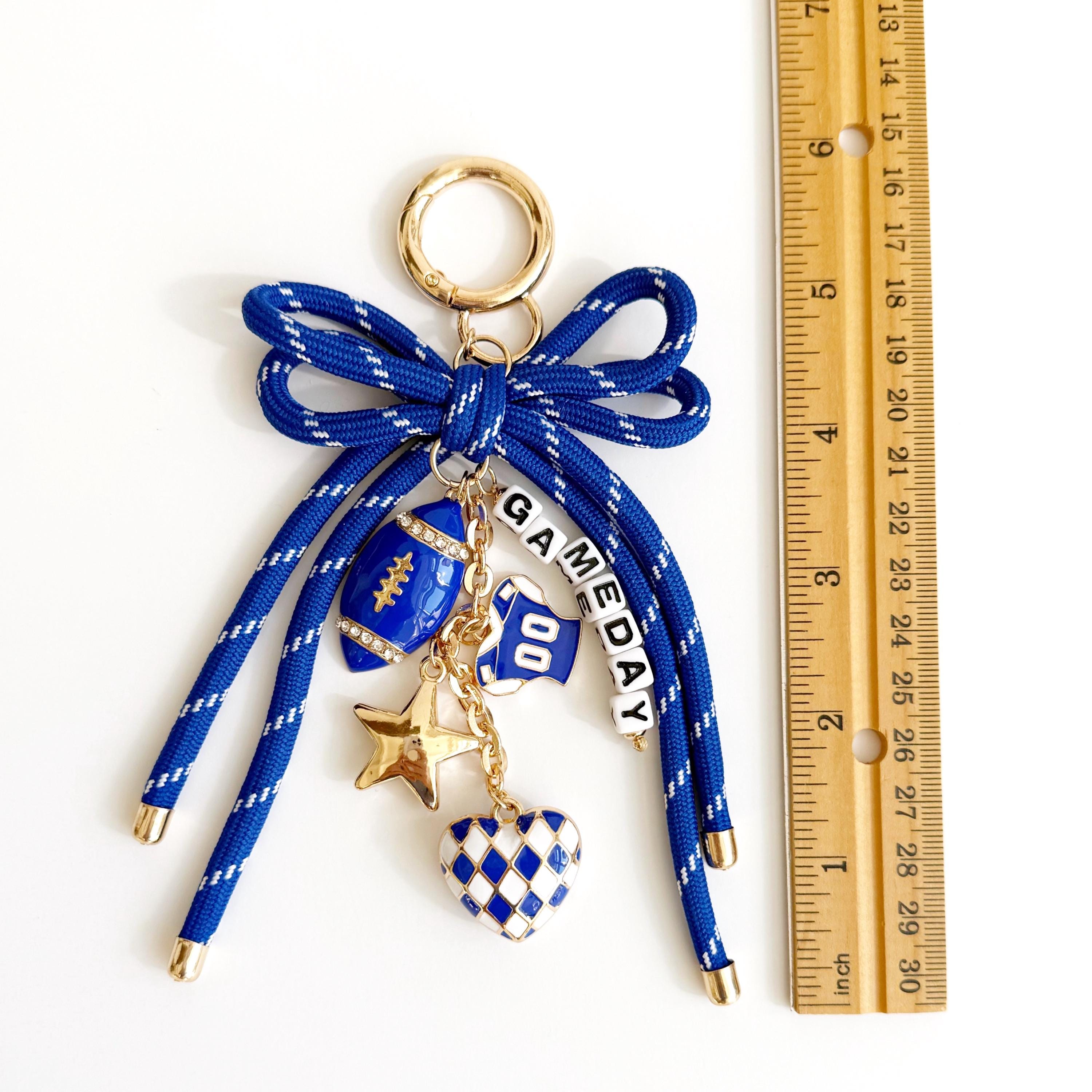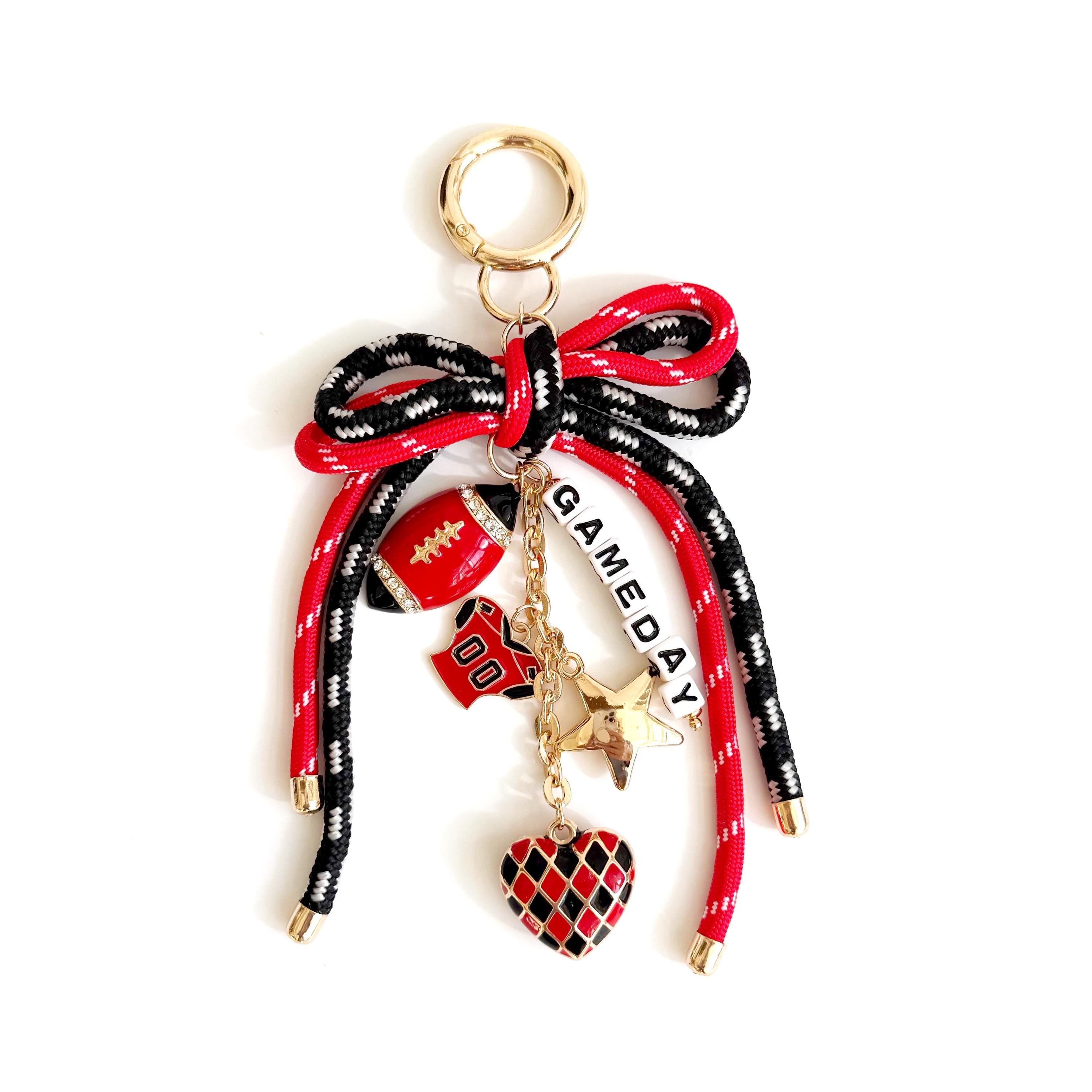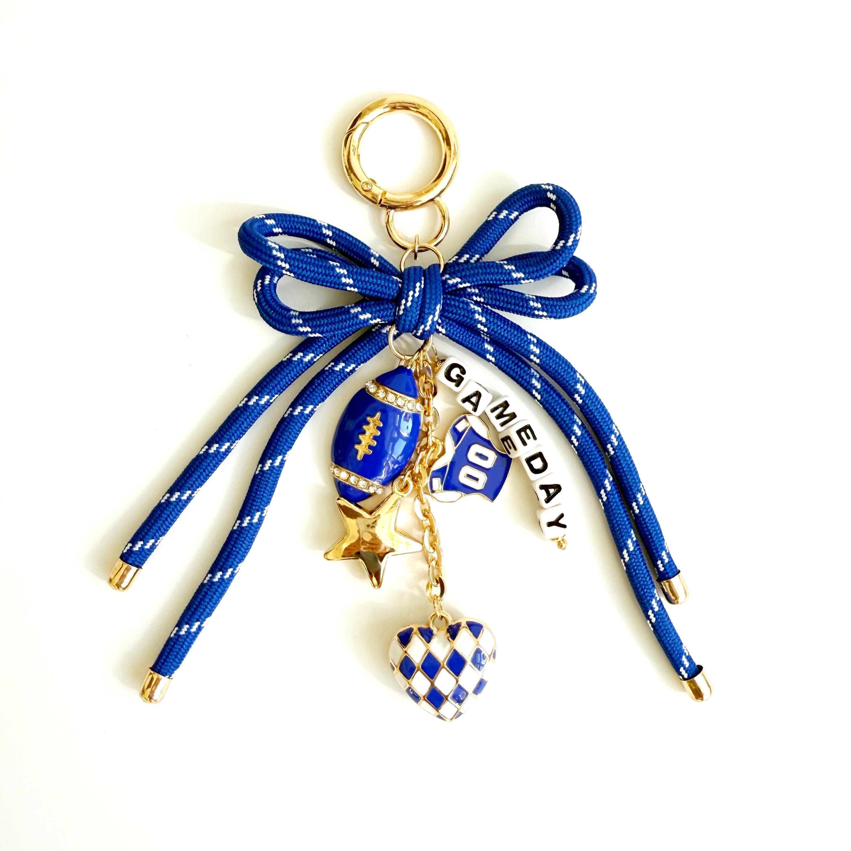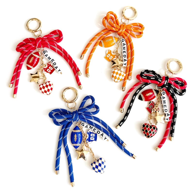 Bring team spirit everywhere you go with this fun Game Day accessory! Use as a keychain or trendy bag charm for football season! Featuring colorful shoelace bows, gold chains, and playful football-themed charms, this accessory is perfect for adding a sporty touch to your keys, purse, or game day bag. Each charm includes a football, helmet, heart, star — making it the ultimate fan accessory.