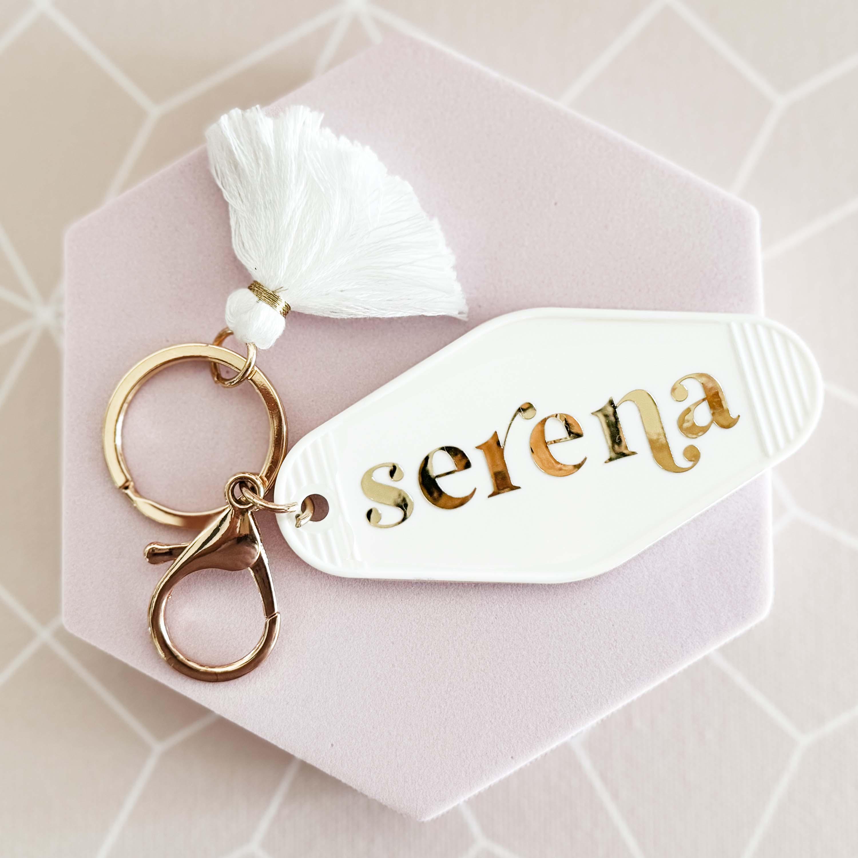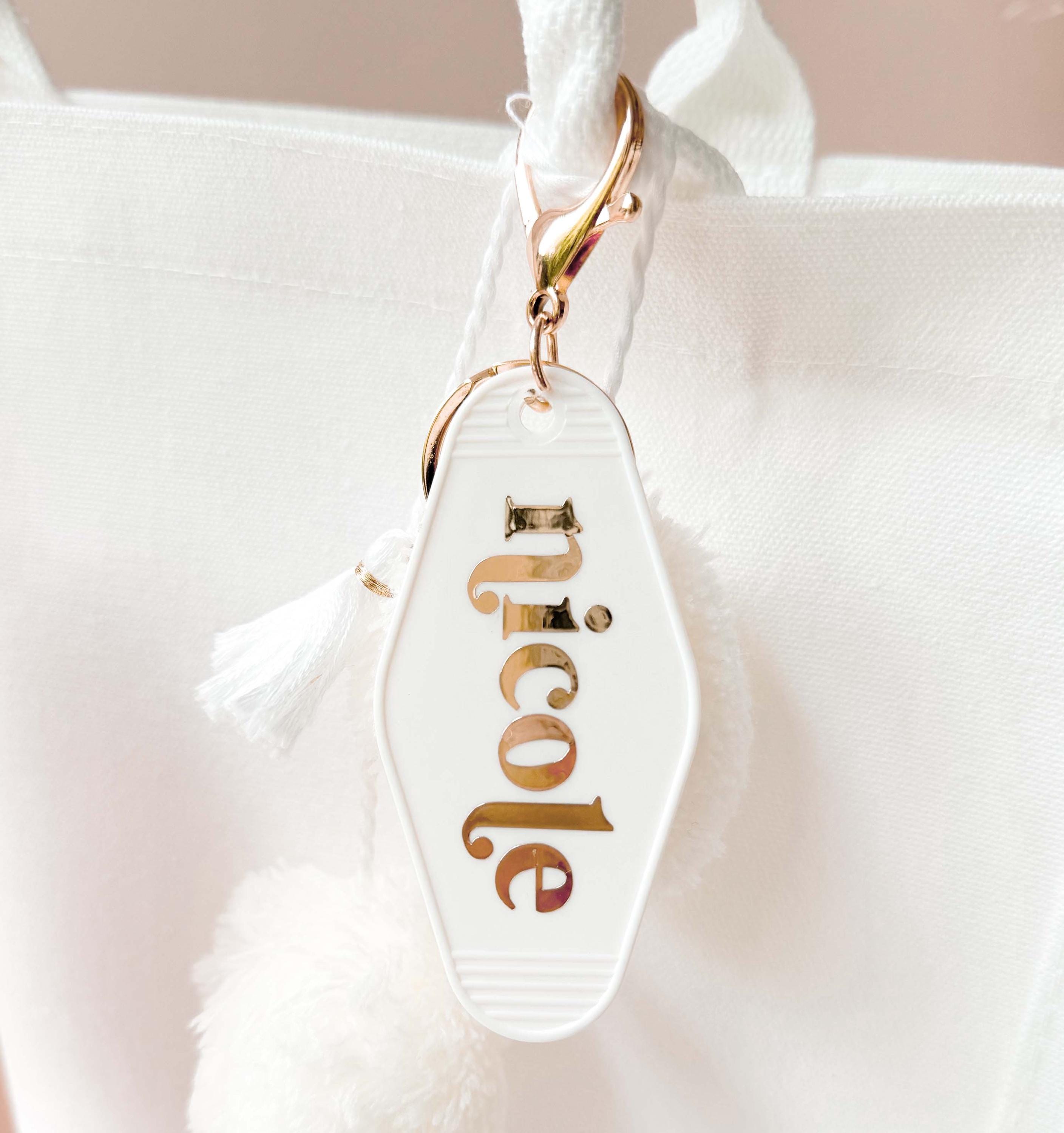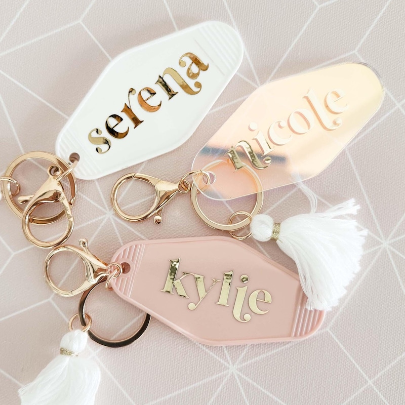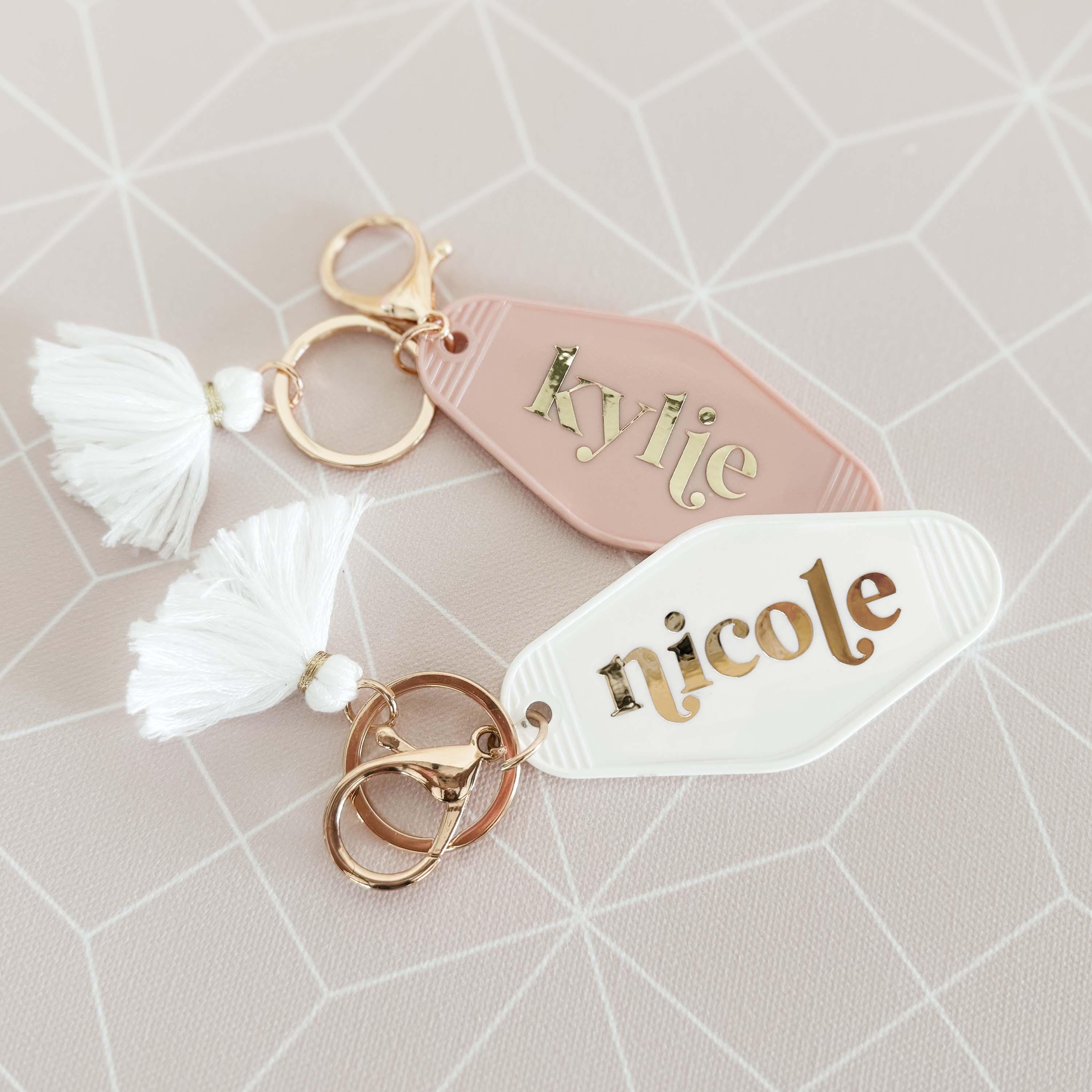 Personalized Motel Keychains make a cute birthday gift for friends or add to your bridesmaids gifts! These retro hotel motel keychains are customized with her name in a pretty gold lettered font. Each keychain has a white fringe tassel and lobster clasp in a light gold finish.
