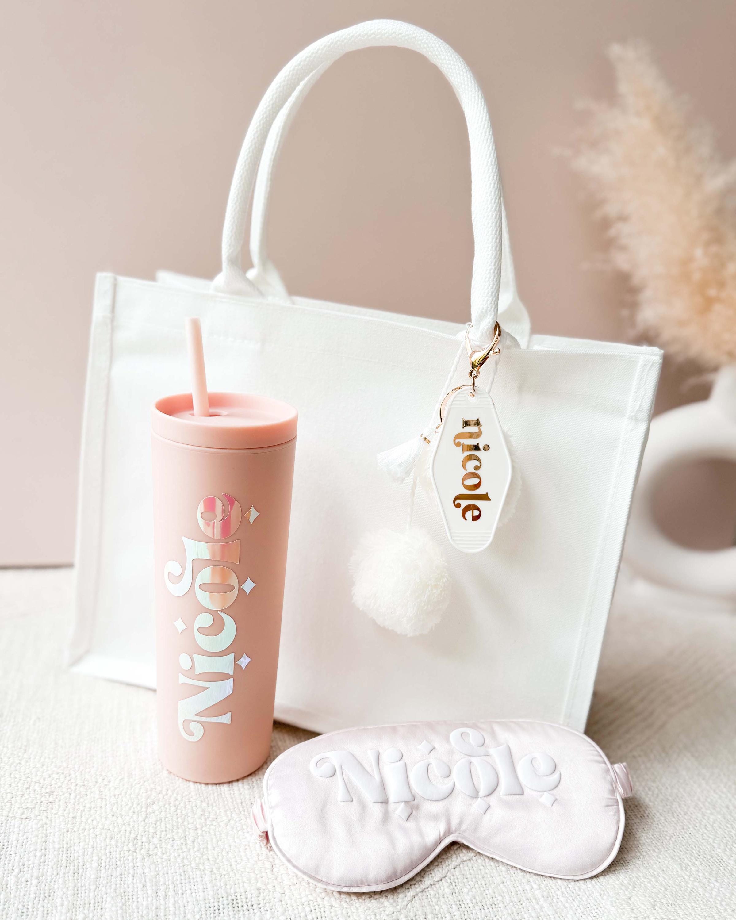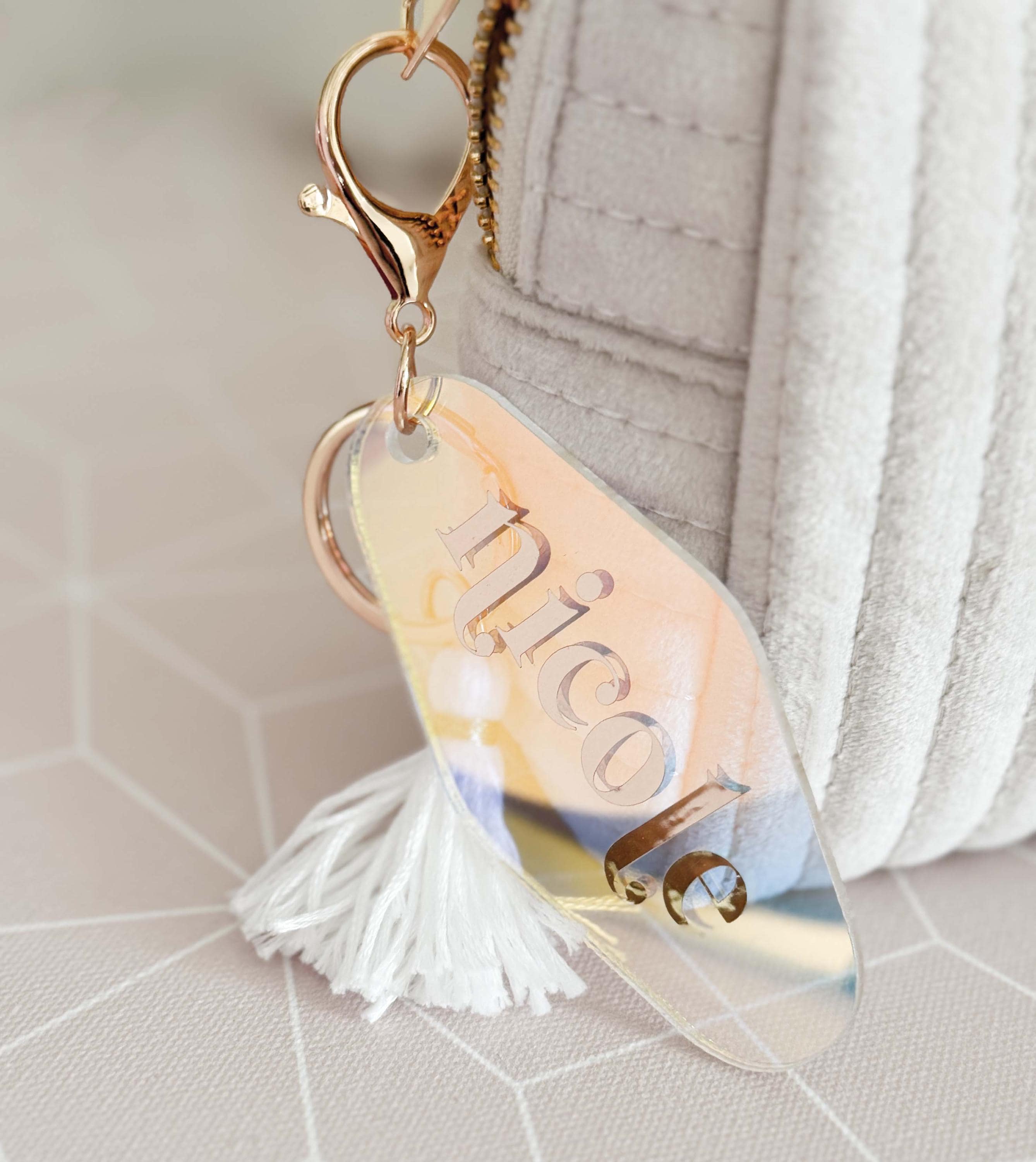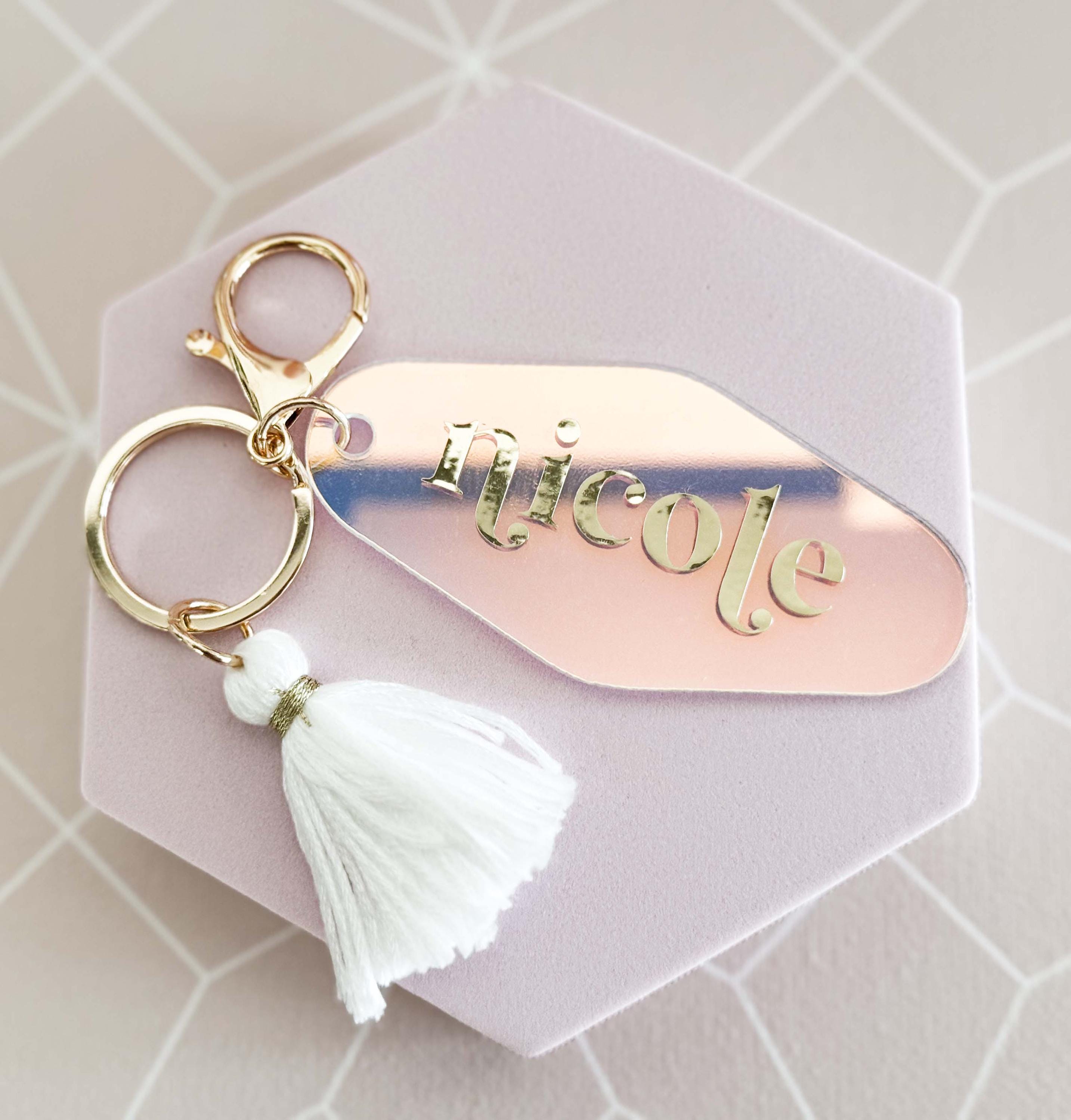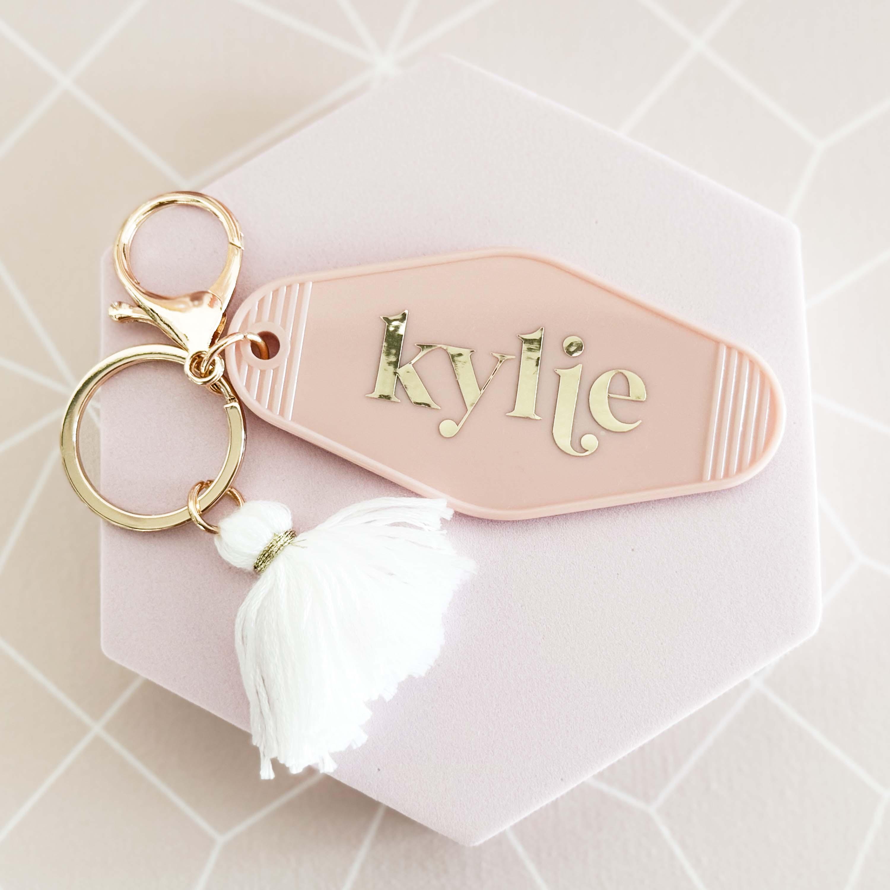 Personalized Motel Keychains make a cute birthday gift for friends or add to your bridesmaids gifts! These retro hotel motel keychains are customized with her name in a pretty gold lettered font. Each keychain has a white fringe tassel and lobster clasp in a light gold finish.