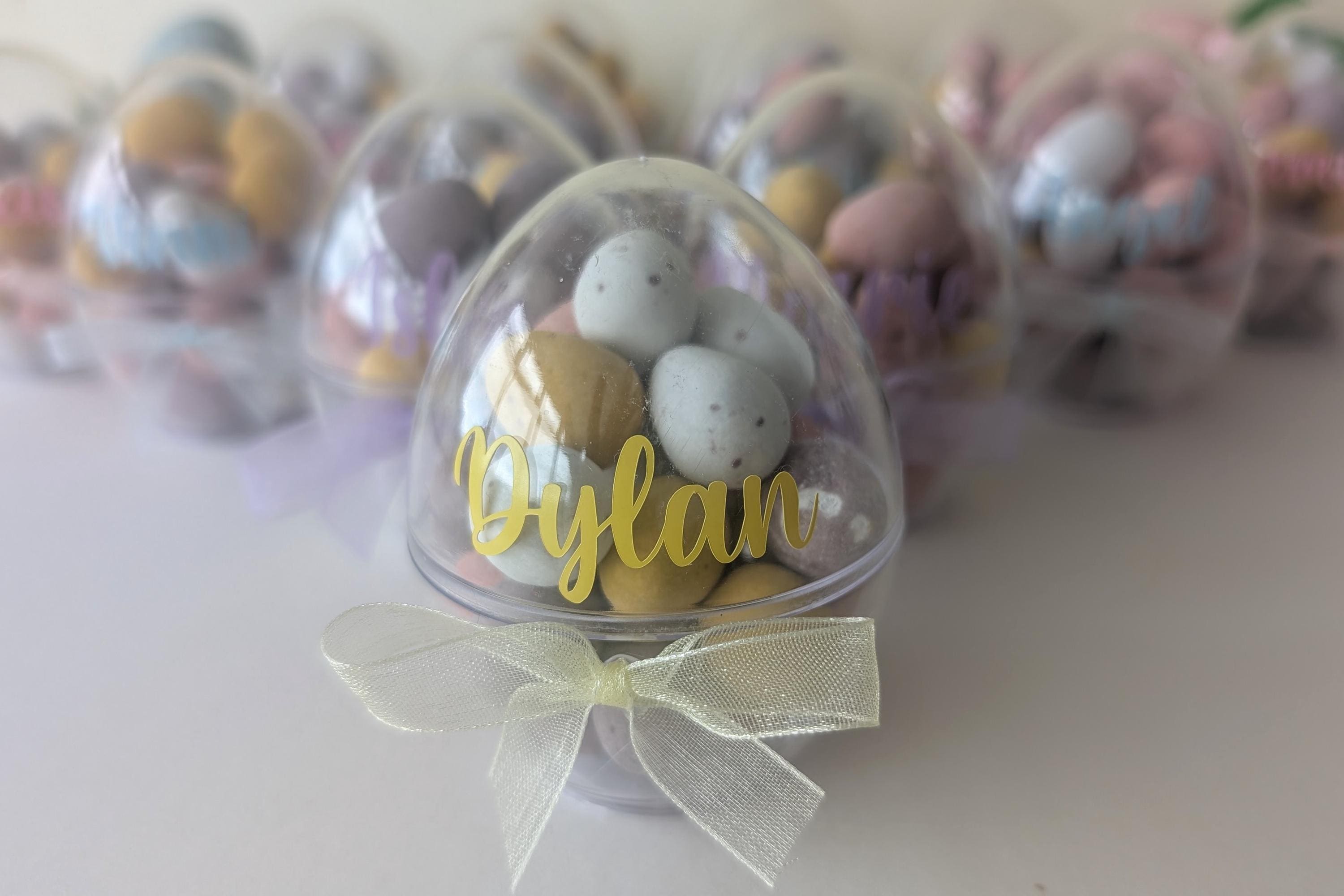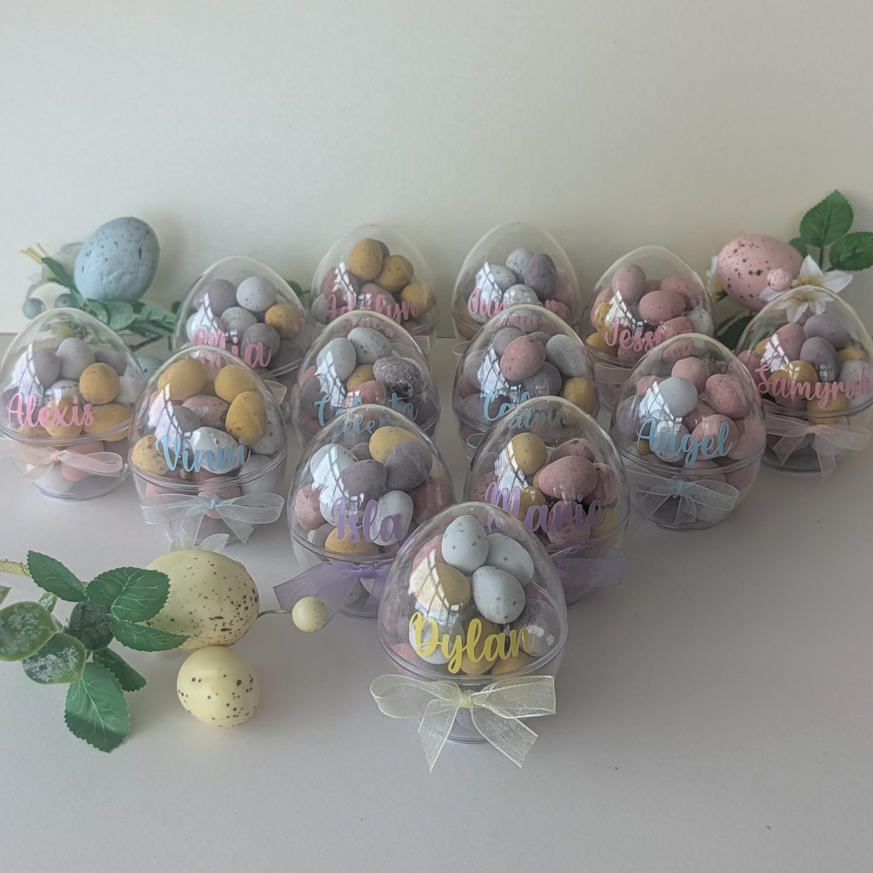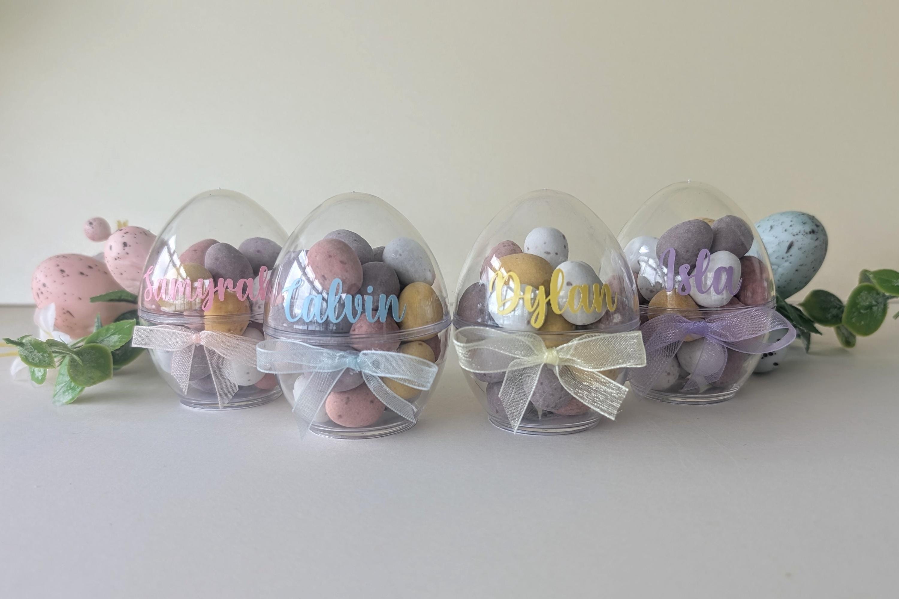 The Personalized Name Easter Egg Plastic Container is a delightful treat for kids this Easter! This charming container can be customized with the child's name, making it a special gift for the holiday. Filled with mini eggs and sweet surprises, it's perfect for Easter egg hunts or as party favors.