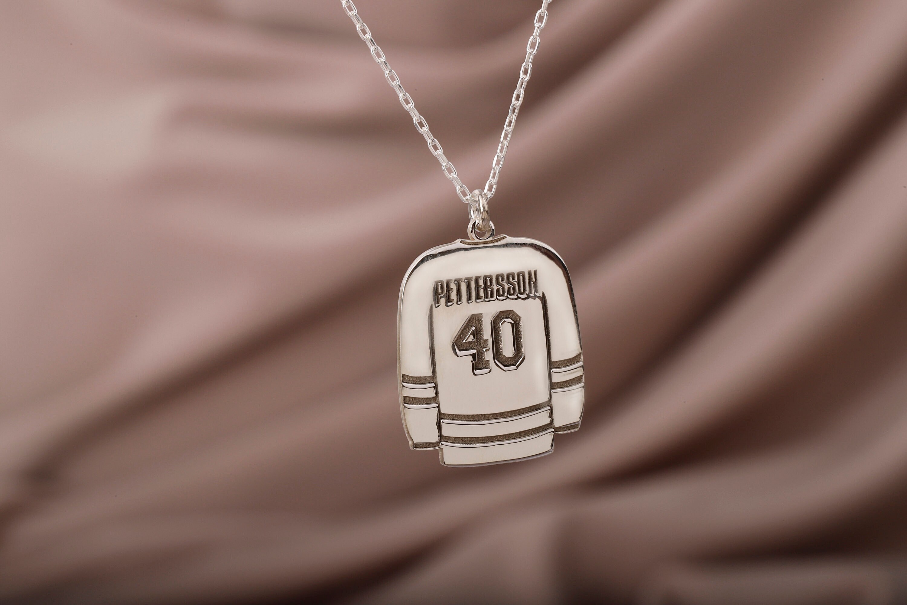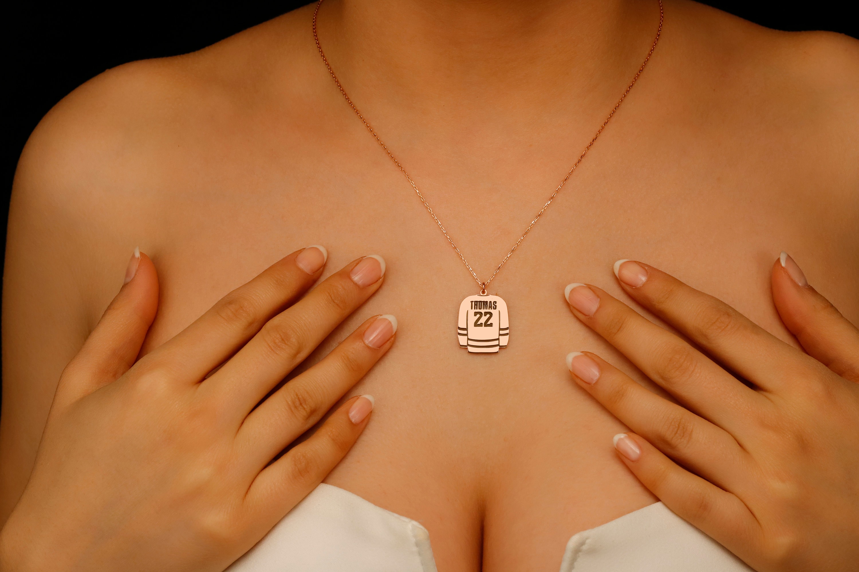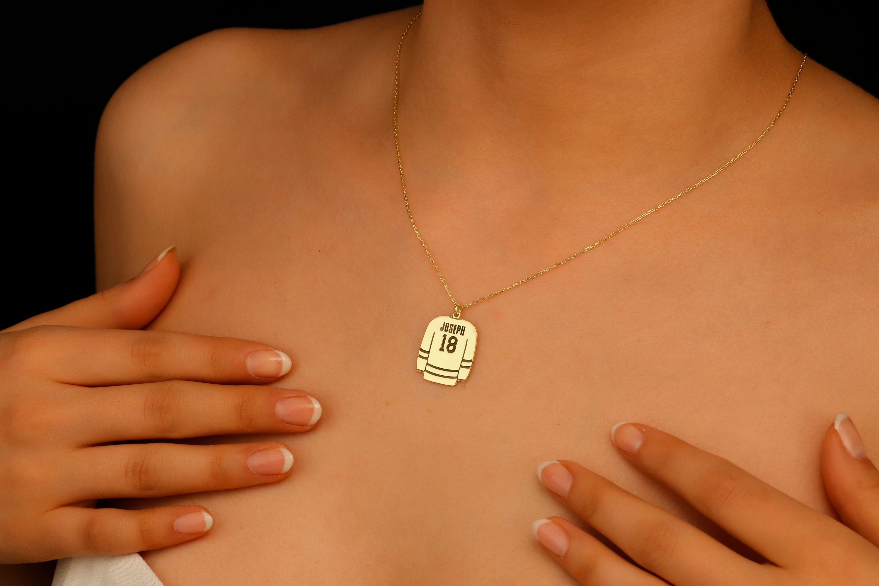 UNIQUE DESIGN - Celebrate your love for the sport with our hockey uniform pendant necklace. Made with 18k gold plating to ensure durability and lasting shine. Option to have name, jersey number engraved on the pendant for an added touch of uniqueness.
