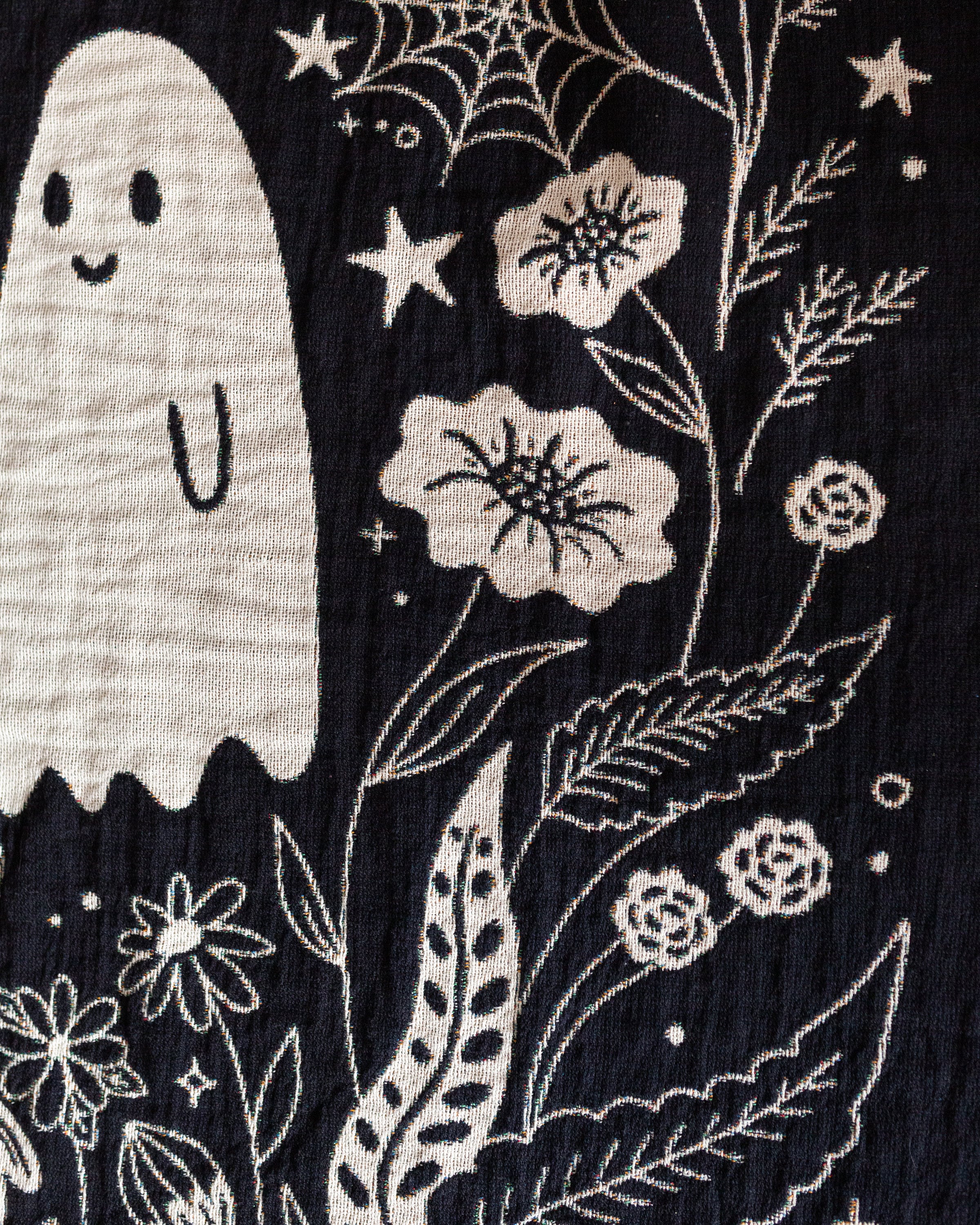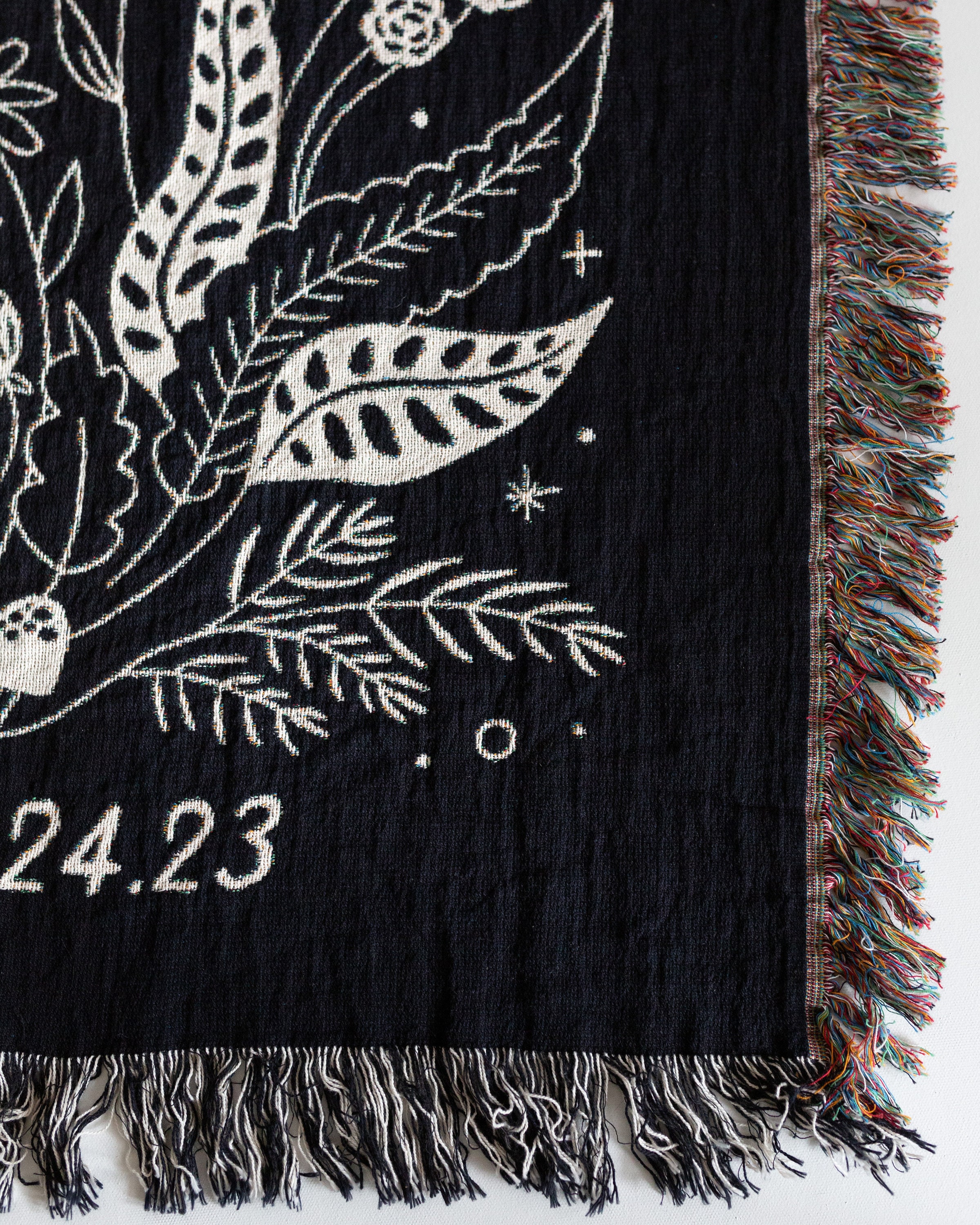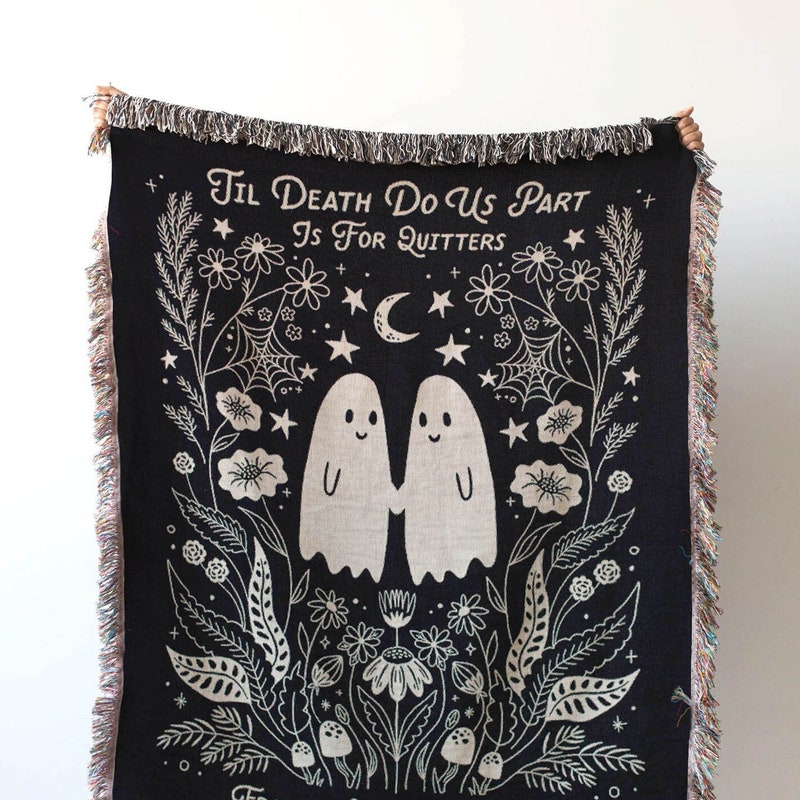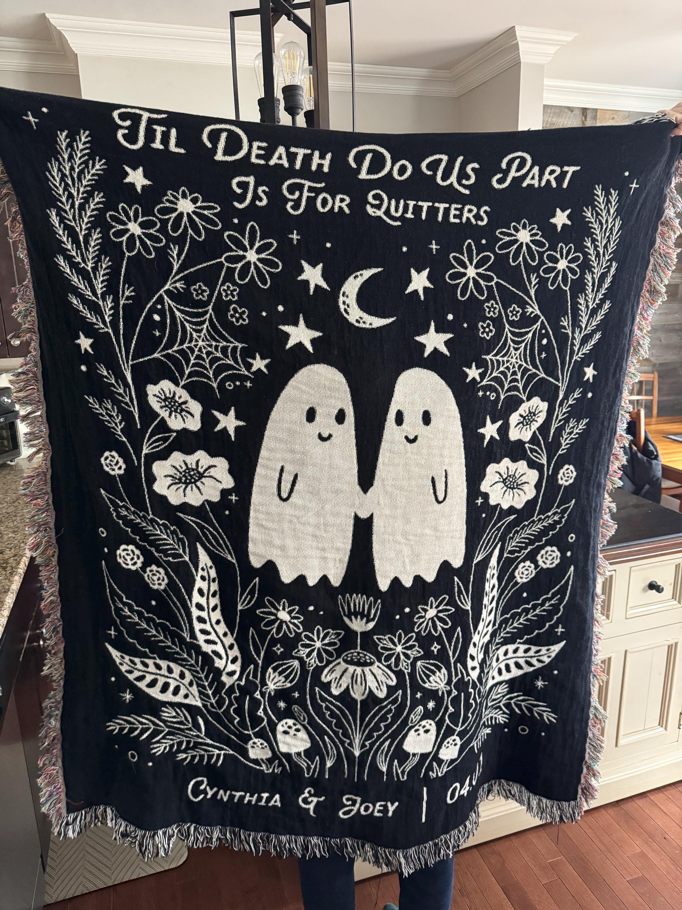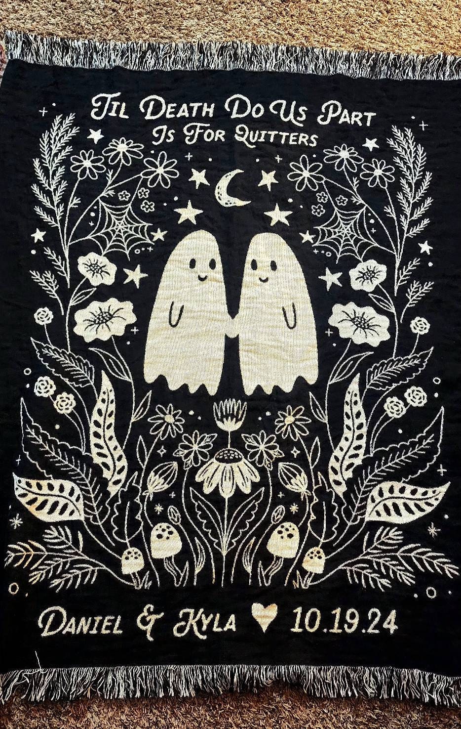 This 100% cotton throw blanket features a ghost and floral motif on a black background, along with the text "Til Death Do Us Part Is For Quitters". There's room for names and/or a date at the bottom! It's a perfect gift for your favorite spooky person or couple.